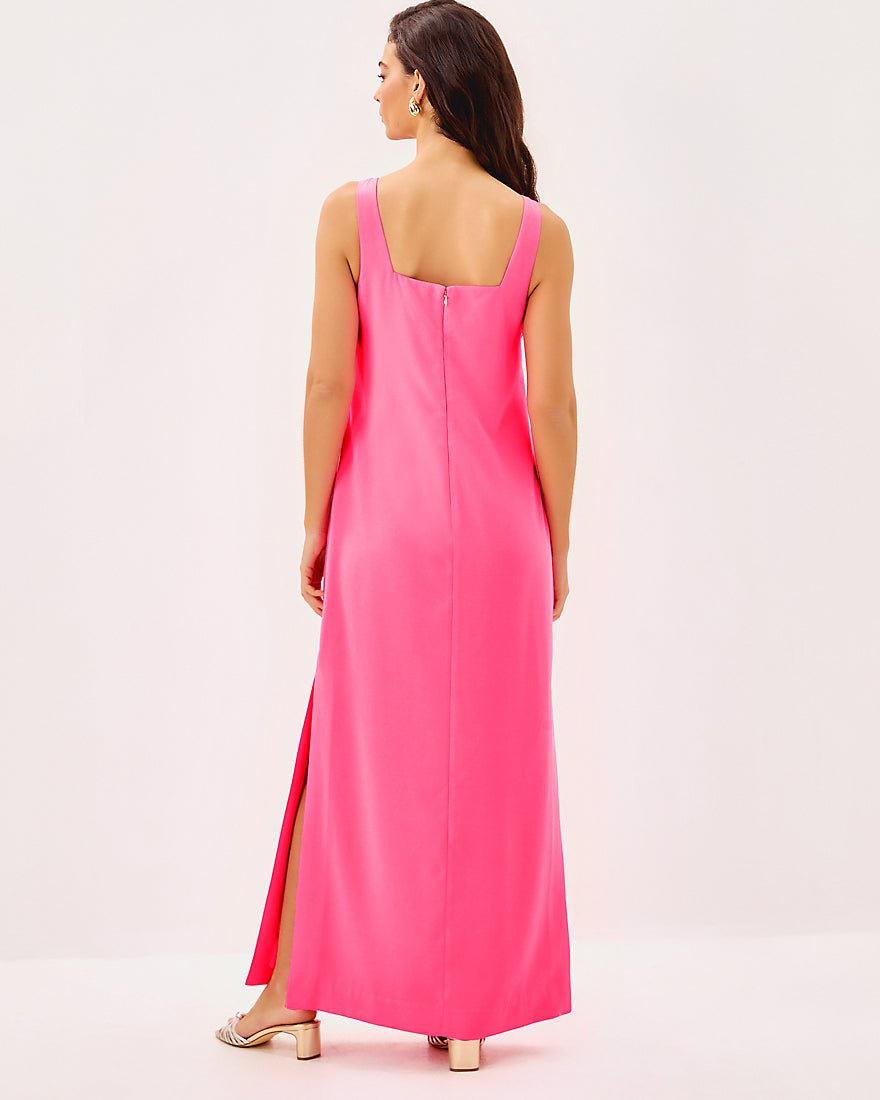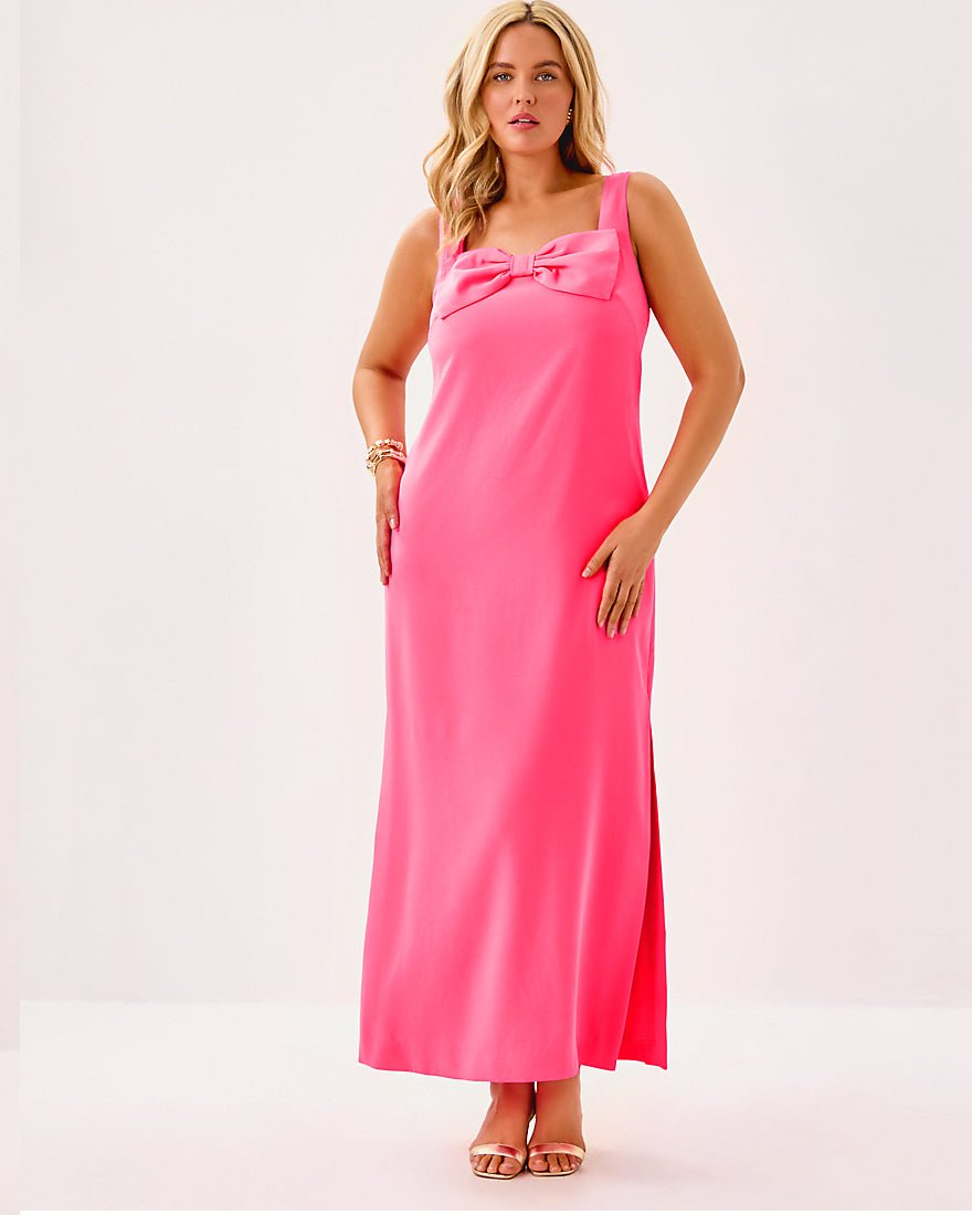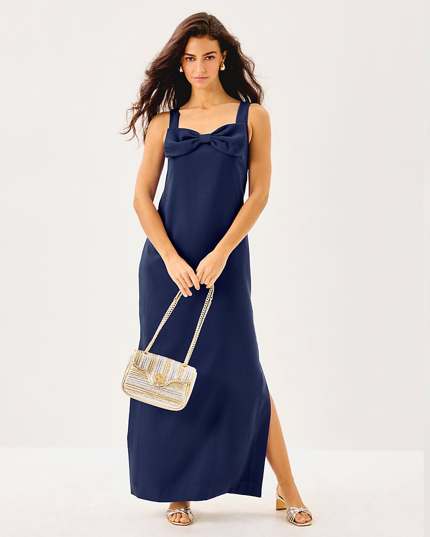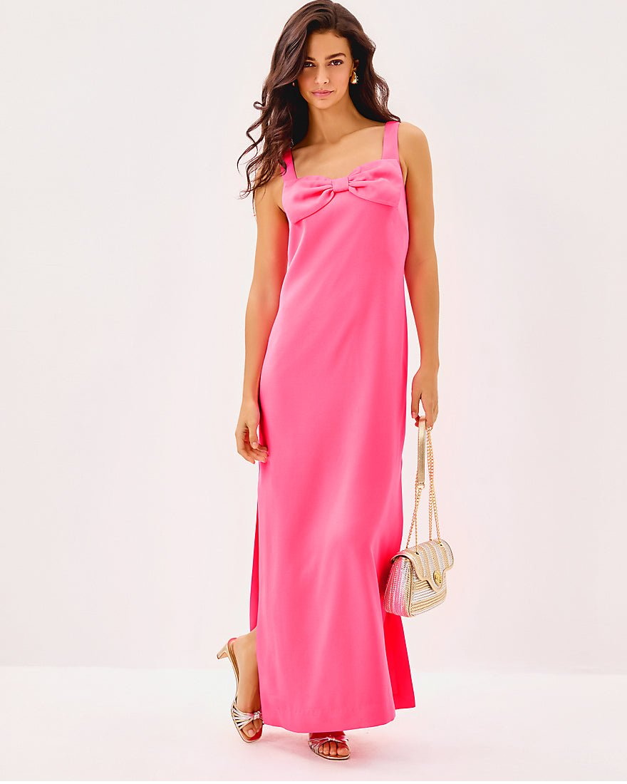 - Straight fit maxi dress with a large bow at the front neckline and side slits.