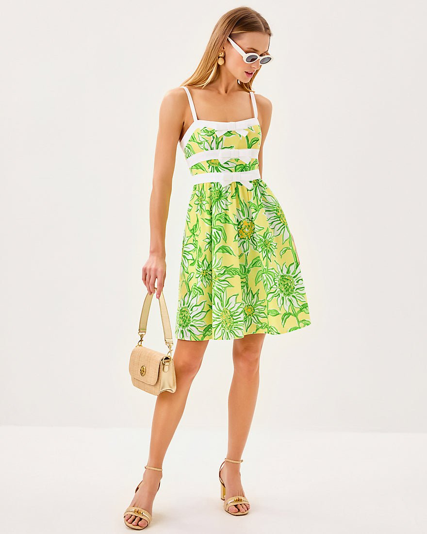- Fit-and-flare sundress with adjustable straps, bodice cups, a smocked back panel, and side seam pockets.