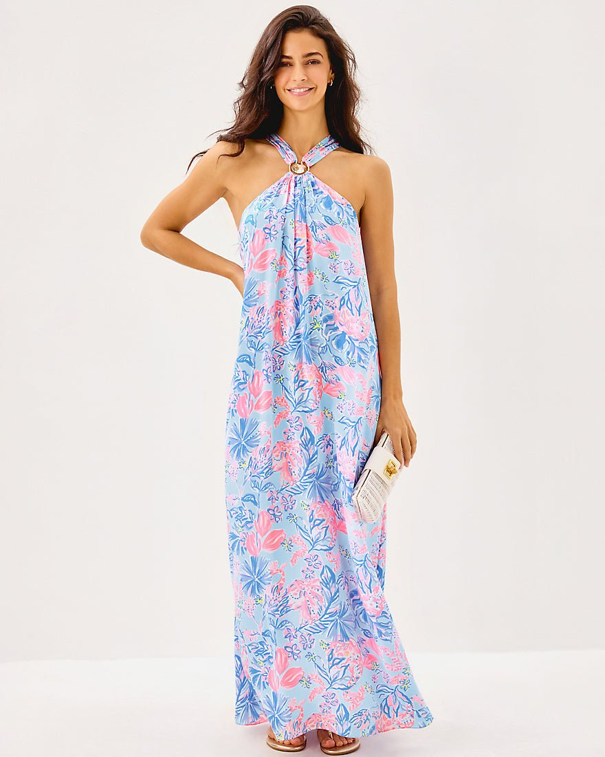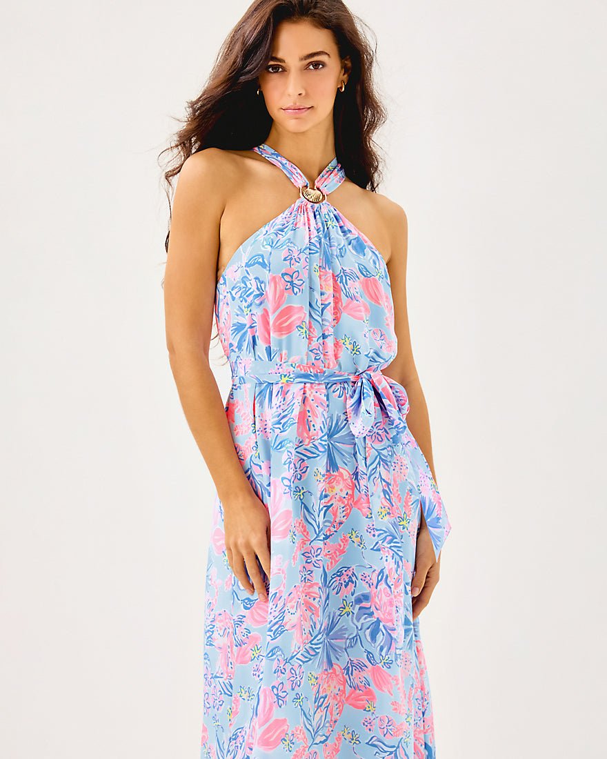 - Swing fit, halter maxi dress with gold shell hardware and a separate sash.