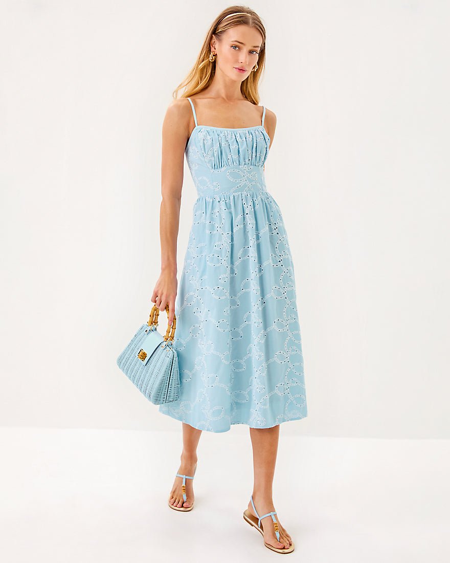 - Fit-and-flare midi dress with a ruched upper bodice, bodice cups, and a smocked back panel. This style also features side seam pockets and gold charms at the back straps.