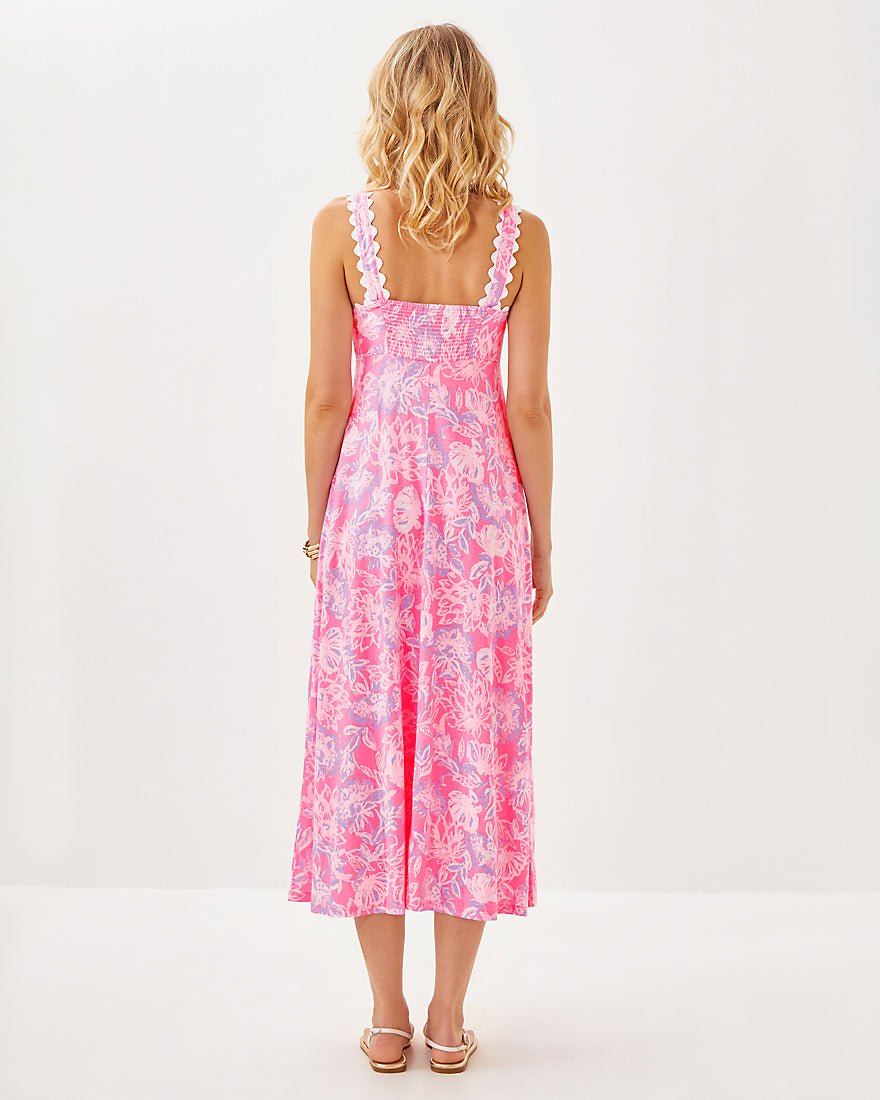 - Swing fit, midi dress with adjustable straps, interior bodice cups, a smocked back panel, and ric rac trim.