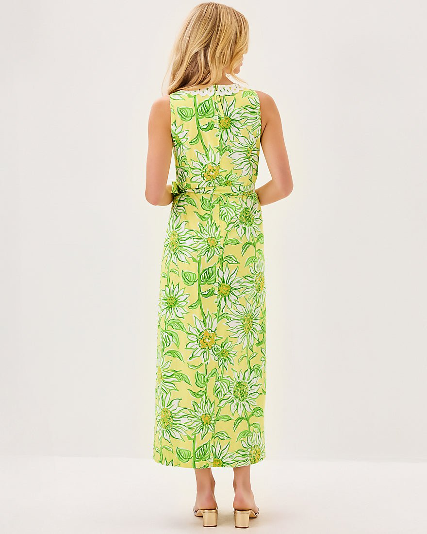 - Fitted maxi dress with a wrap-front skirt, functional tie, and Lilly lace trim.