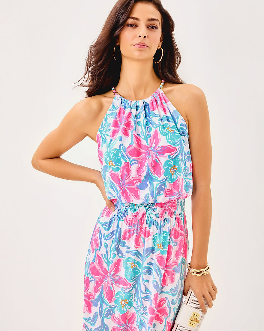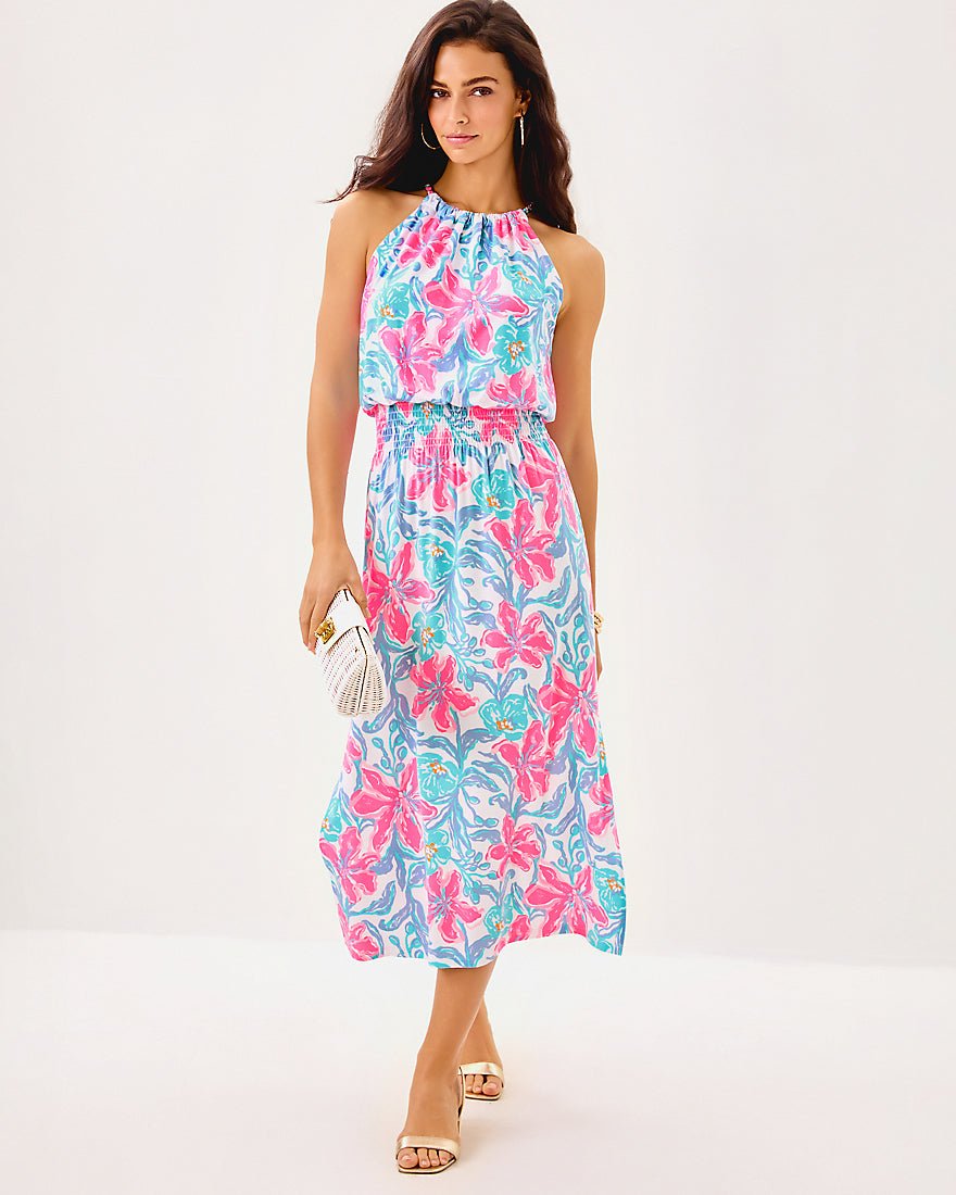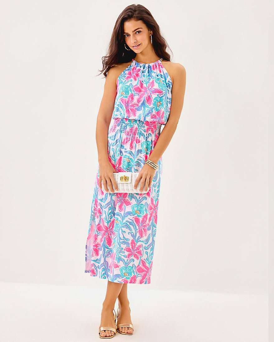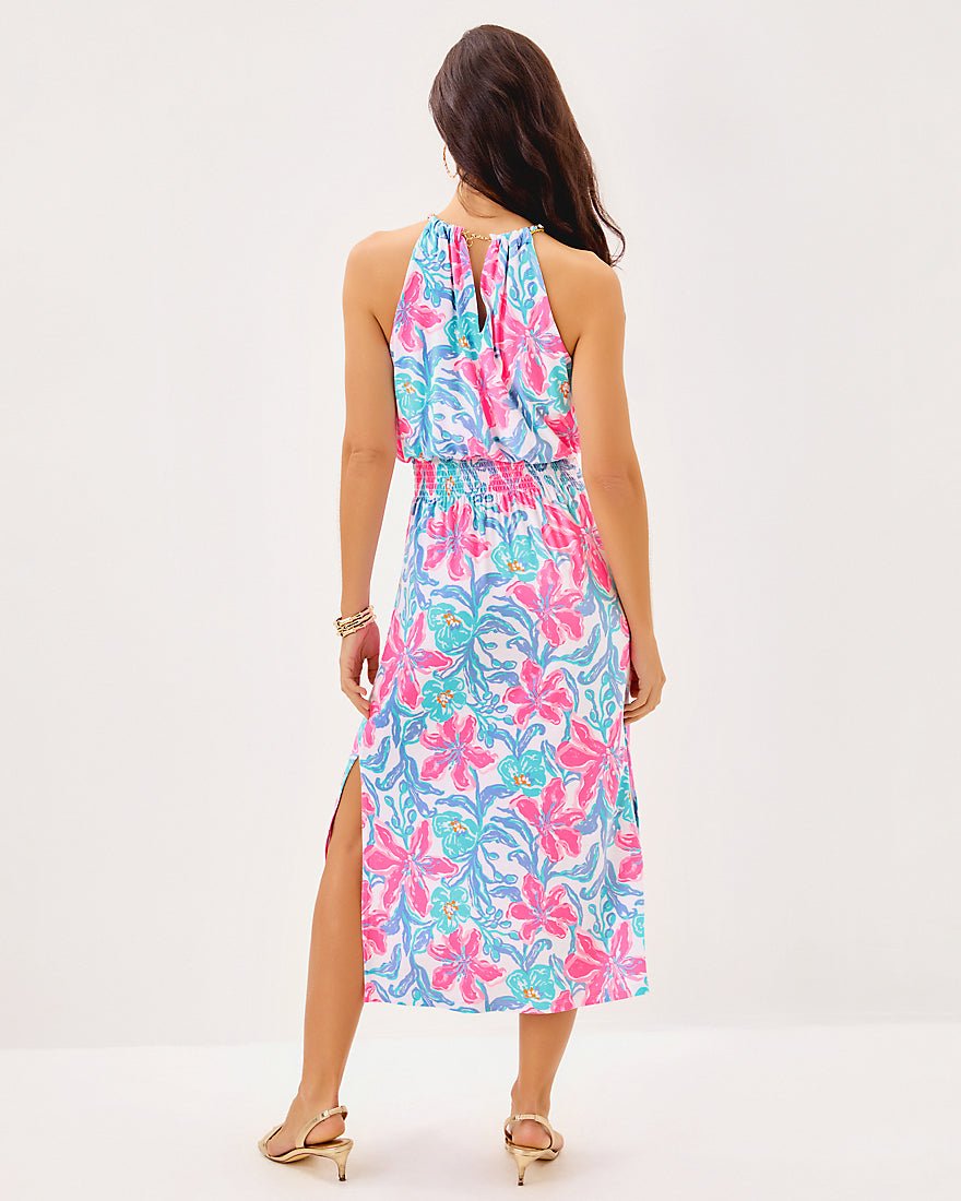 - Easy fit, halter midi dress with a smocked waist, side slits, and gold chain trim at the neckline.
