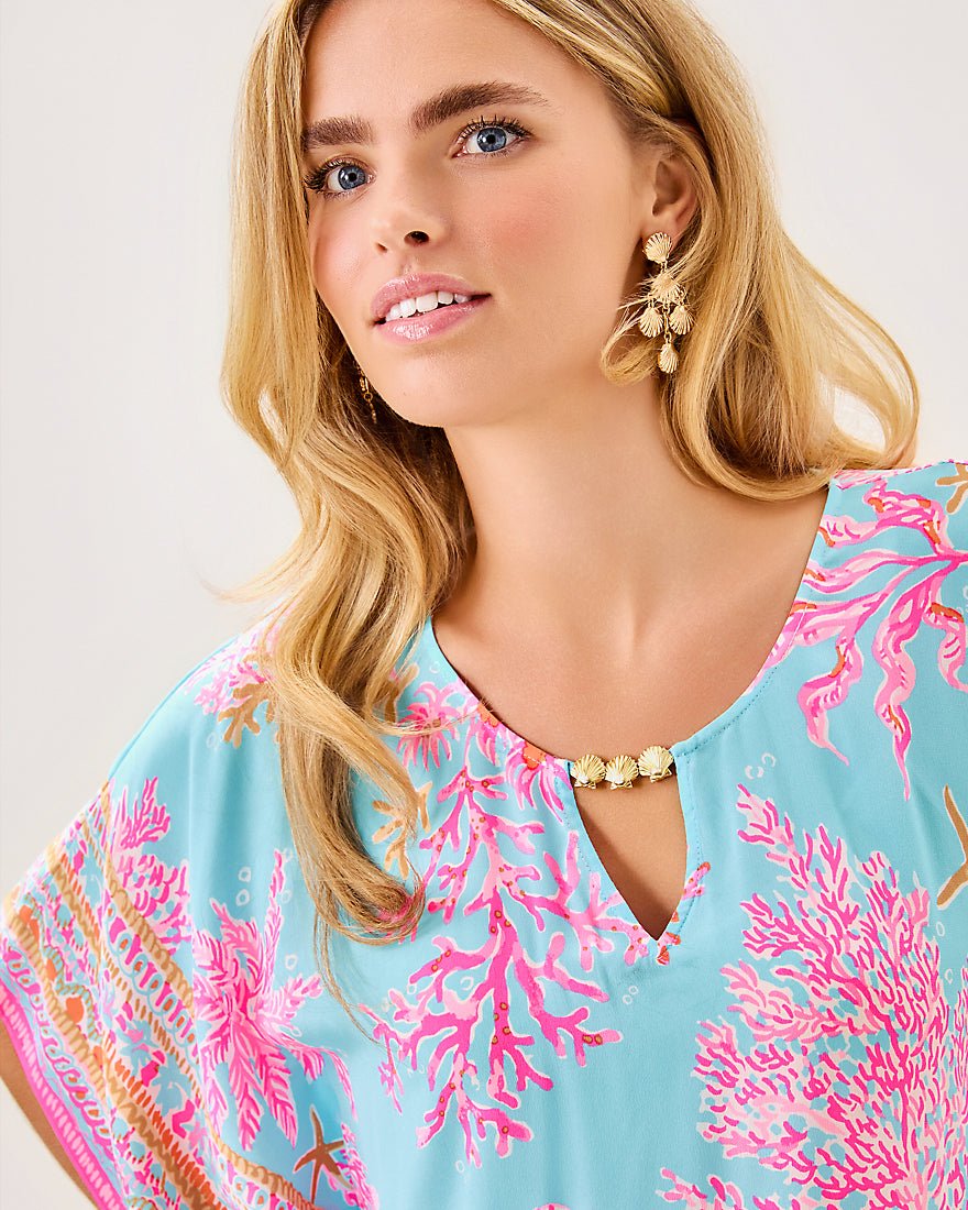 - Straight fit caftan with a notch neckline, gold shell bead detail, and a separate jersey slip.
