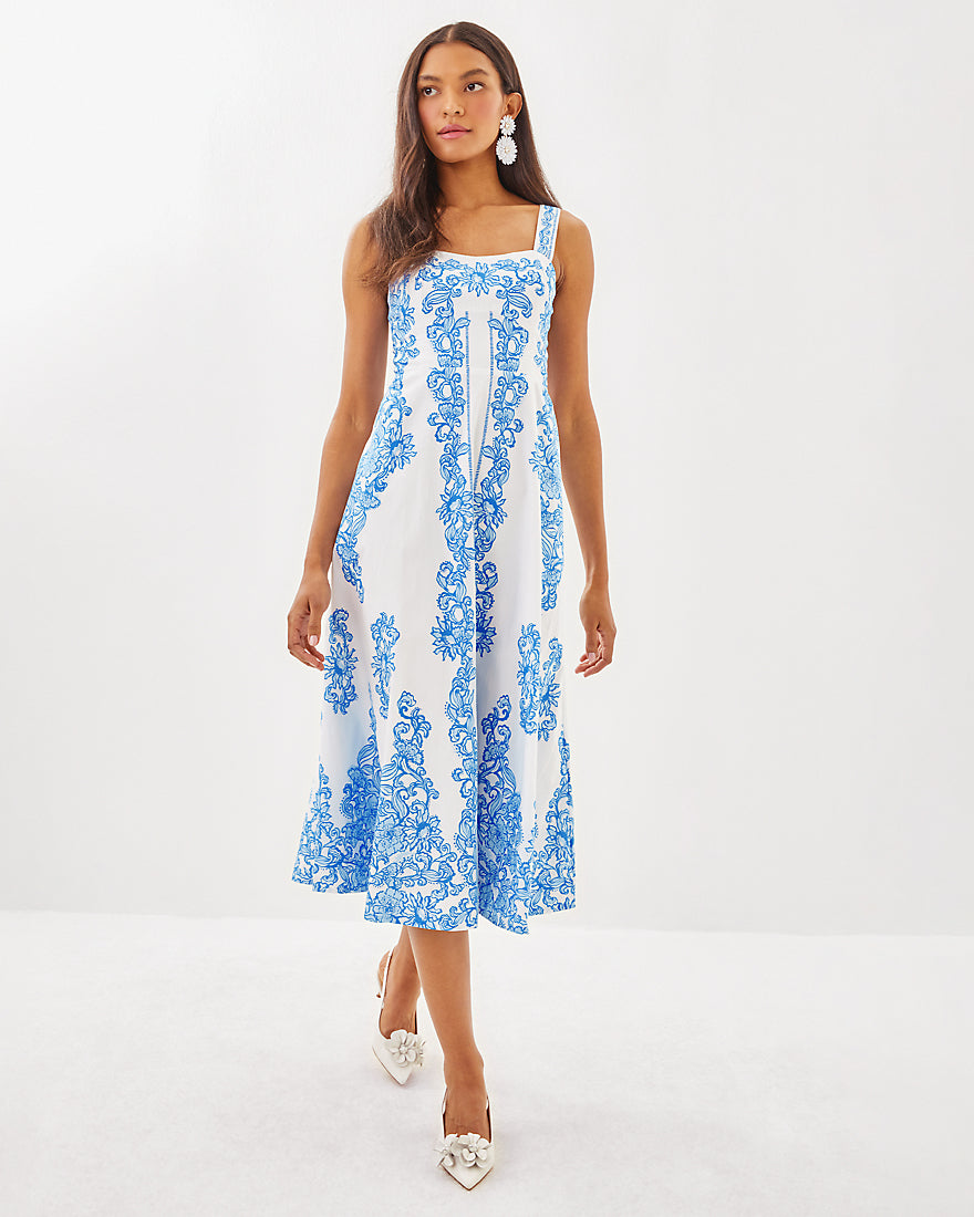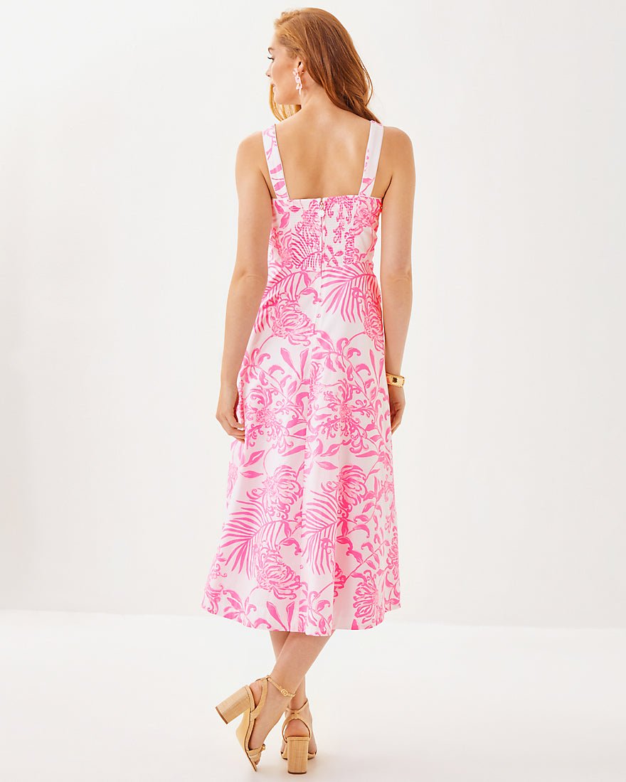 - Fit-and-flare midi dress with adjustable straps, a seamed bodice with cups, smocking, and a full skirt.