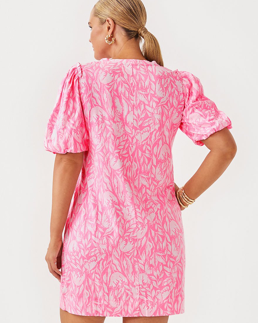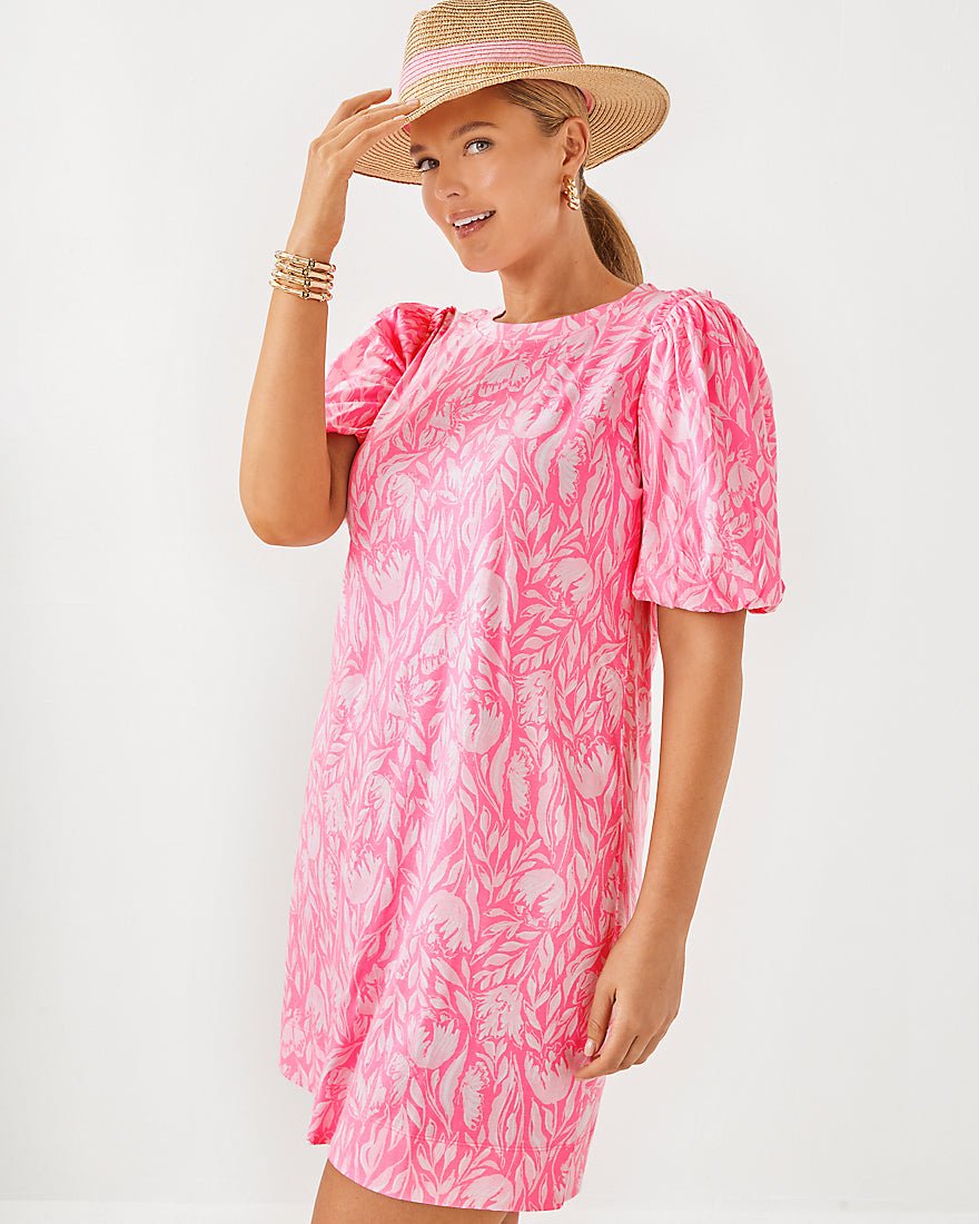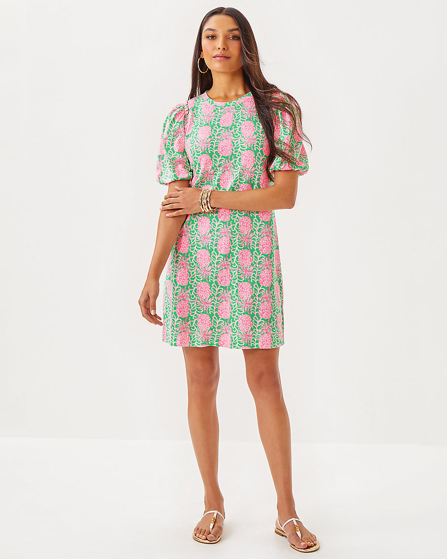 - Straight fit t-shirt dress with a crew neckline and bubble-hem sleeves.