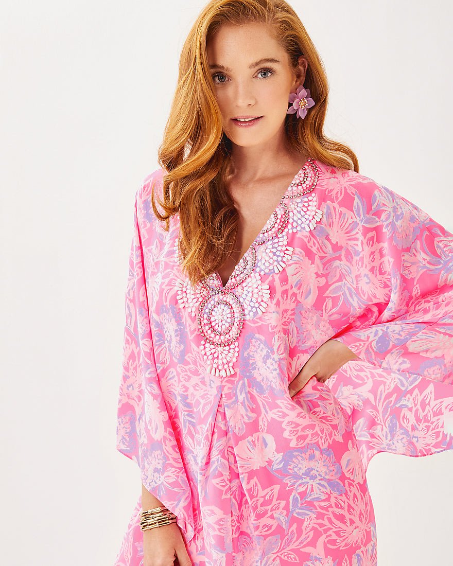 Exude effortless glamour in the Mindy Beaded Silk Maxi Caftan.
