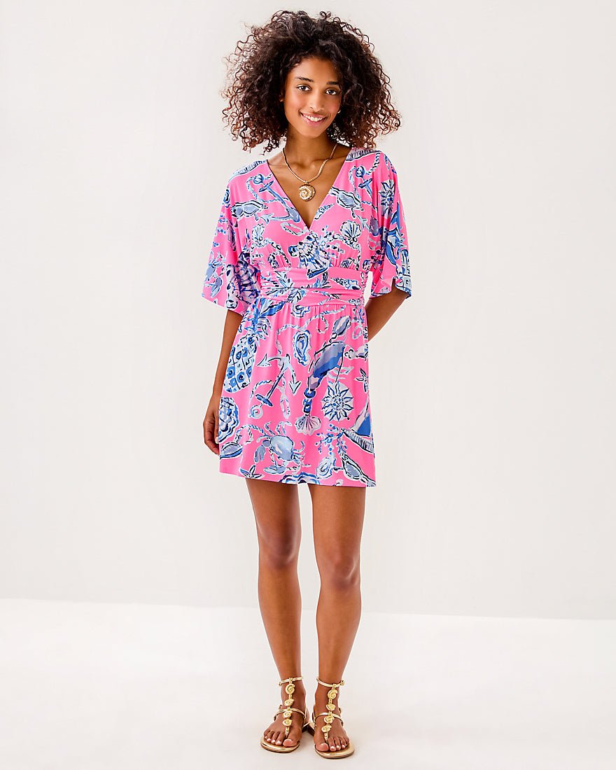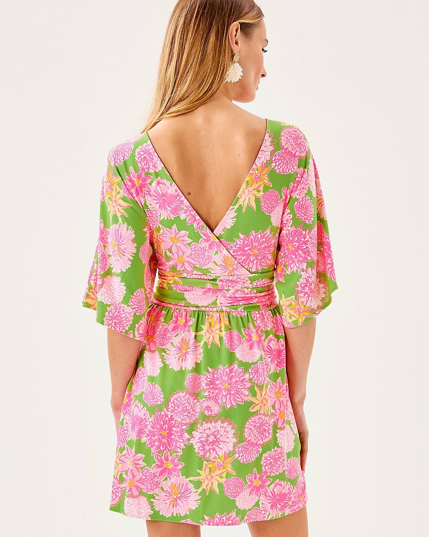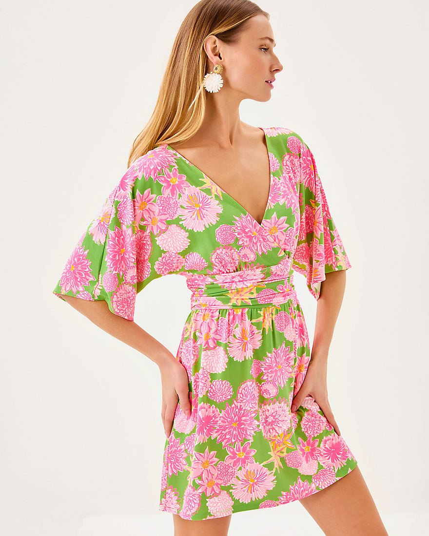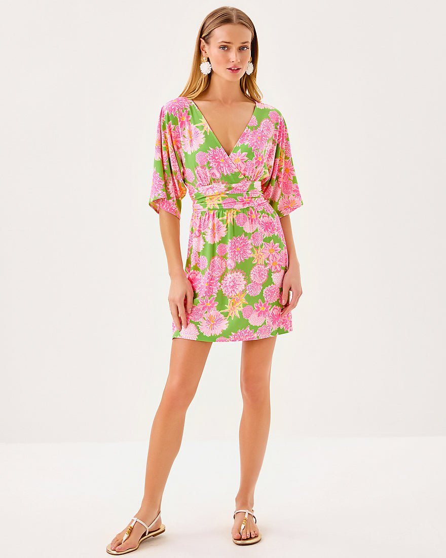- Skirted romper with a surplice neckline, elbow-length kimono sleeves, and a ruched waistband.