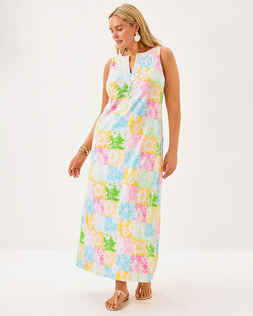 - Straight fit maxi dress with a back slit and soutache embellishment at the notch neckline.
