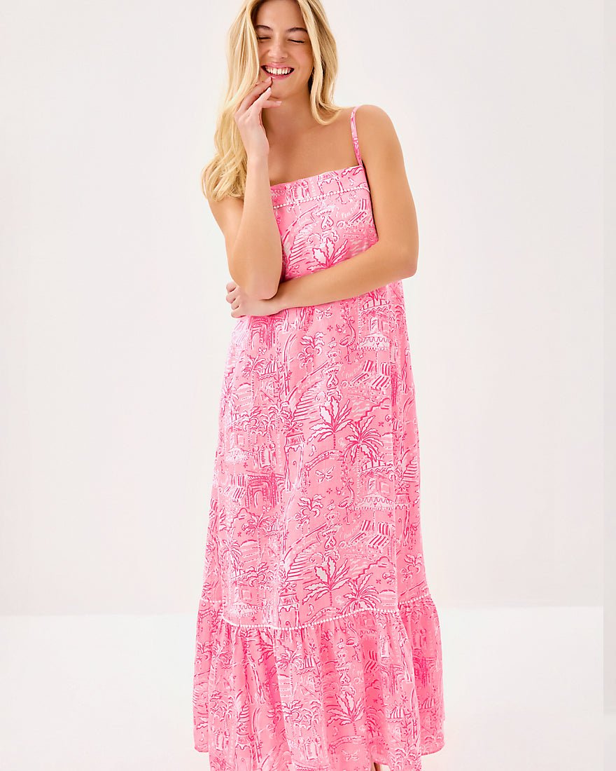 - Swing fit maxi dress with adjustable spaghetti straps, interior shelf bra, and pockets. This style also features a tall hem ruffle and Lilly lace trim.