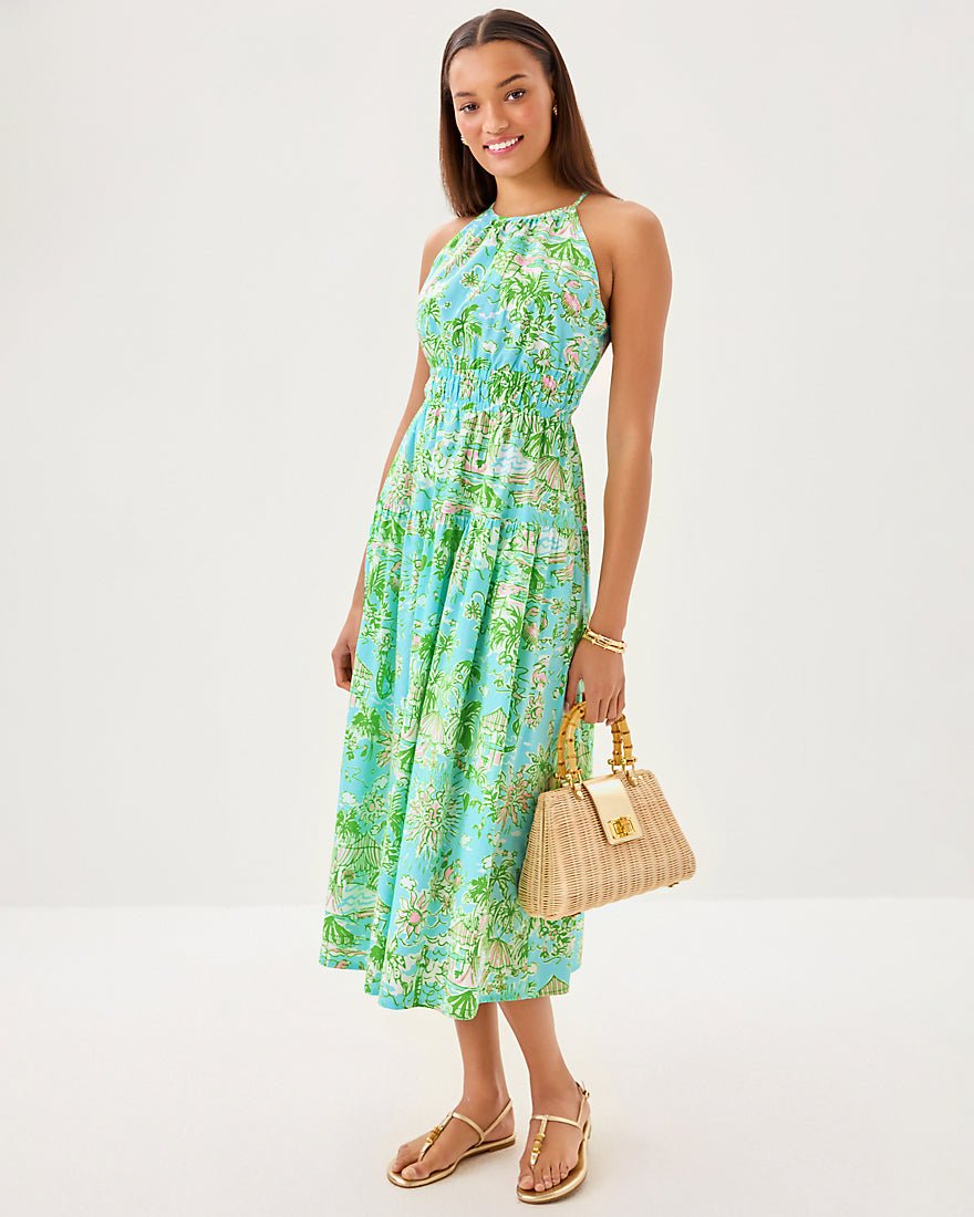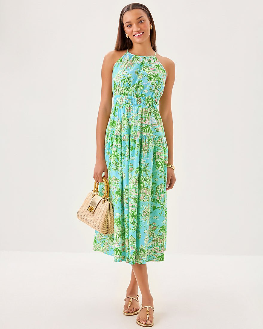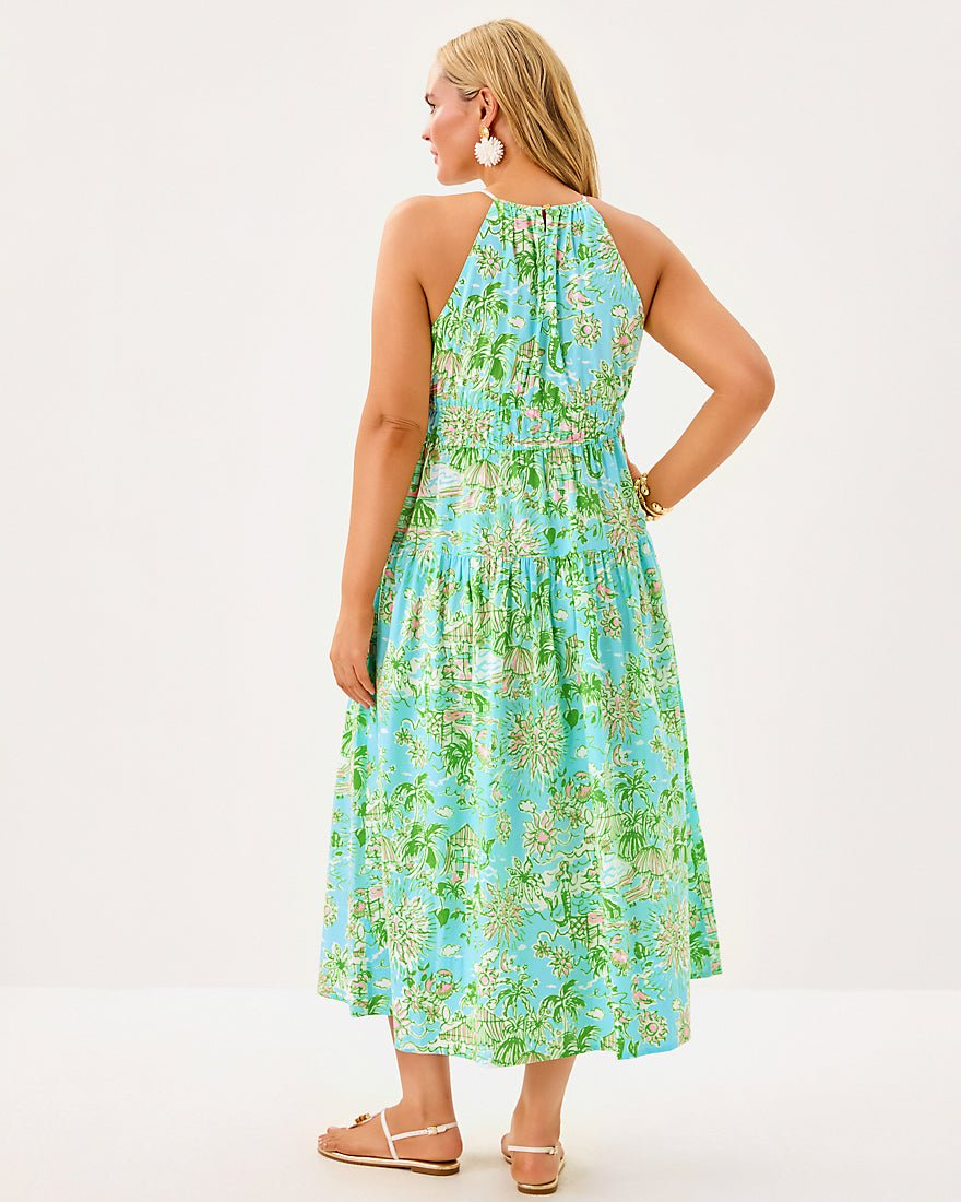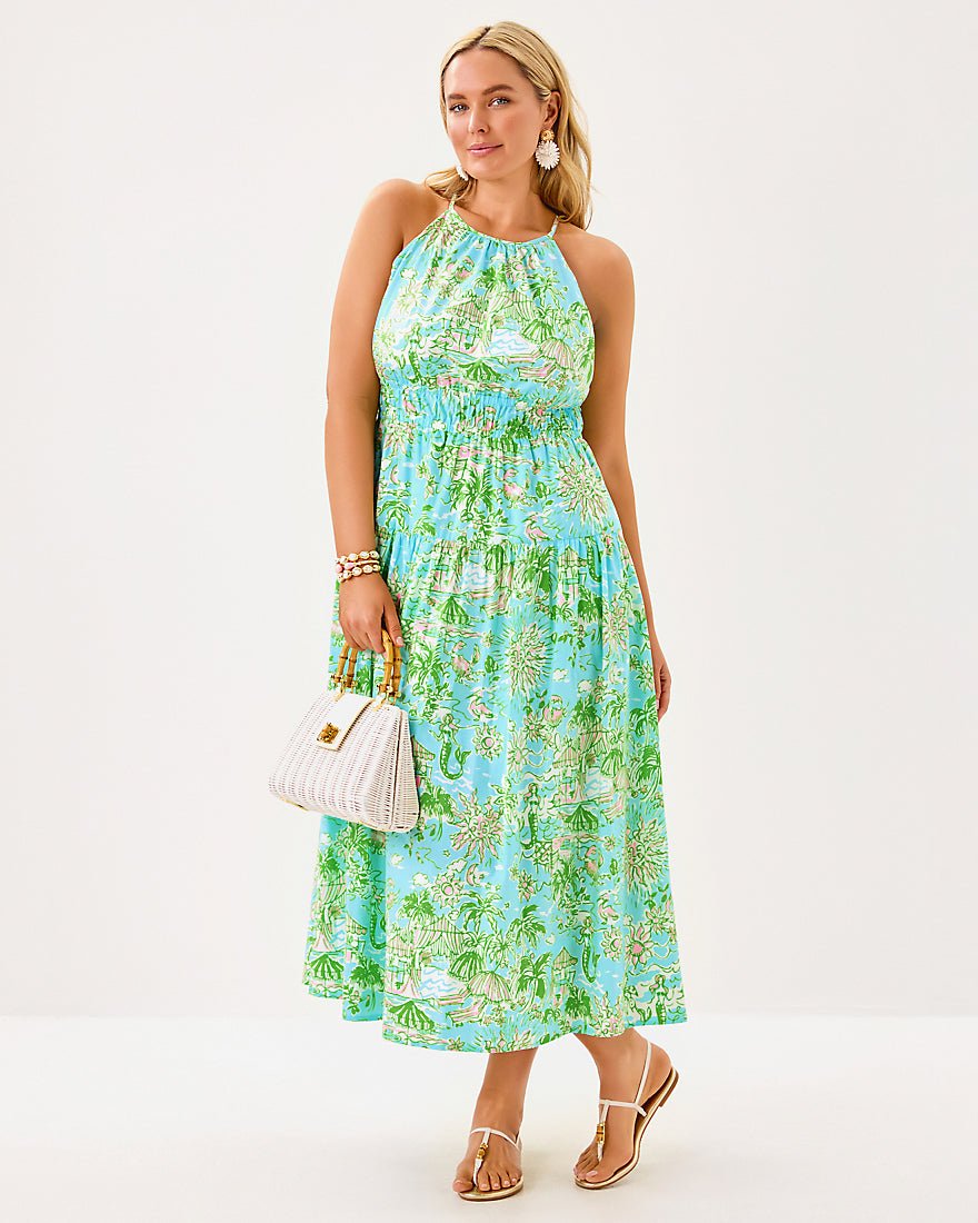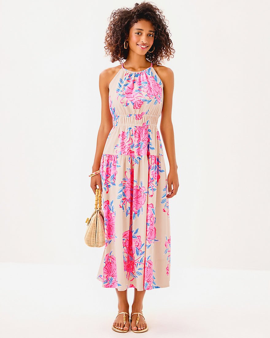 - Fit-and-flare dress with a halter neckline, elastic waist detail, tiered skirt, and side seam pockets.