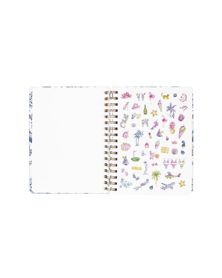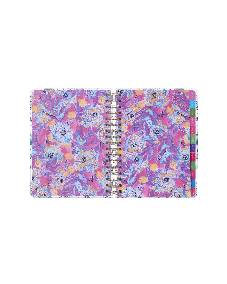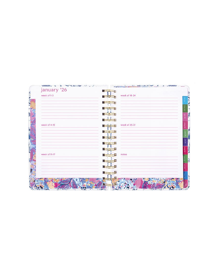 Make plans in print with Lilly's 2025-2026 hardcover, spiral bound agenda in Resort White Barefoot Beachcomber. It includes monthly views for keeping track of every vacation, appointment, playdate, date night, and brunch with your BFFs. Even better, it's delightfully designed with a sticker page, hand-painted art interiors, a reinforced double-sided interior pocket, tabs, gold elastic band closure and spirals, and smooth pages full of colorful prints.