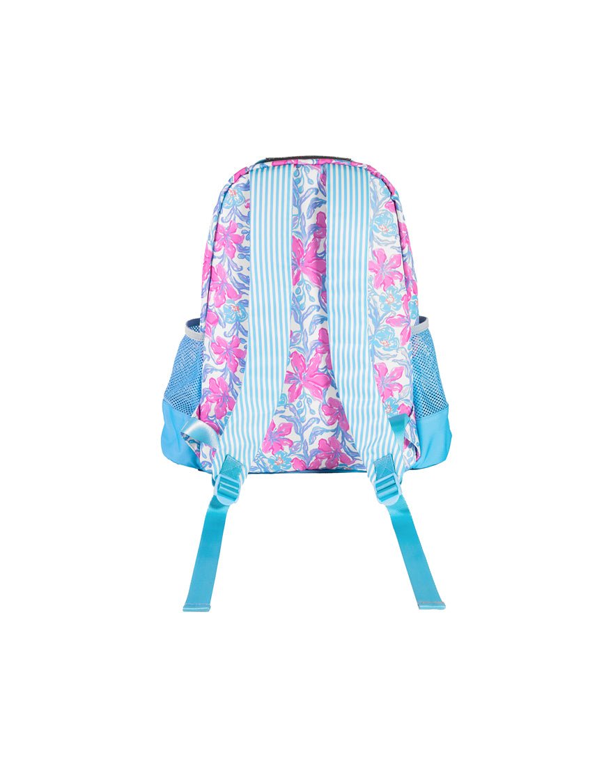 We've got your back with this spacious backpack in Beachside Haven. Sized especially for children, this backpack boasts adjustable straps, mesh pockets, bamboo zipper pulls, interior and exterior pockets, and a gold logo plaque.