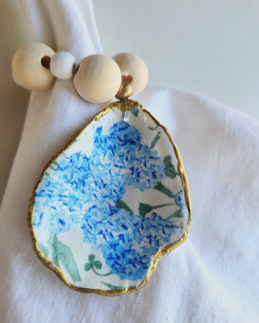 Decorate your table with this set of 4 napkin rings. Decoupage oyster shell surrounded by natural wooden beads.
