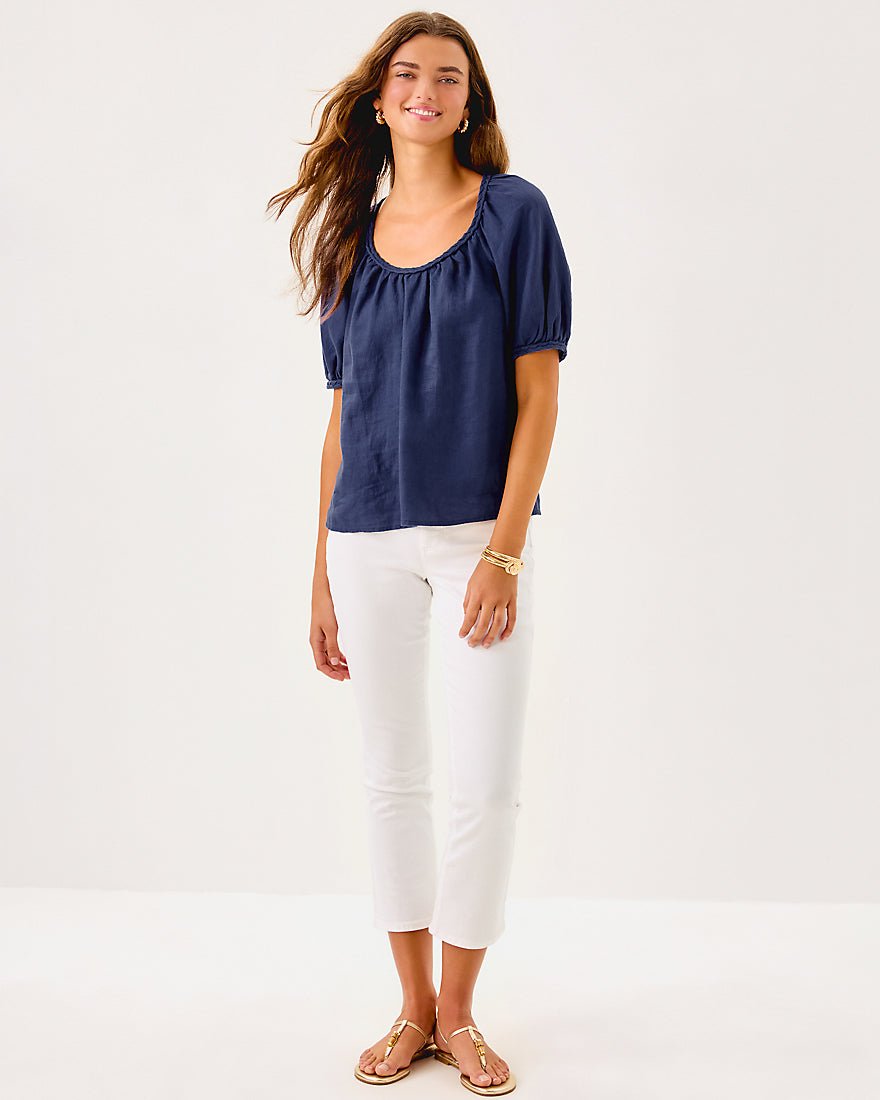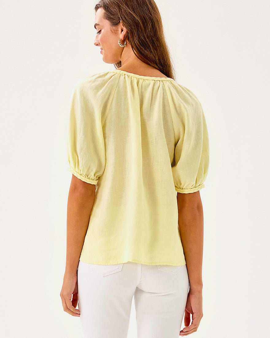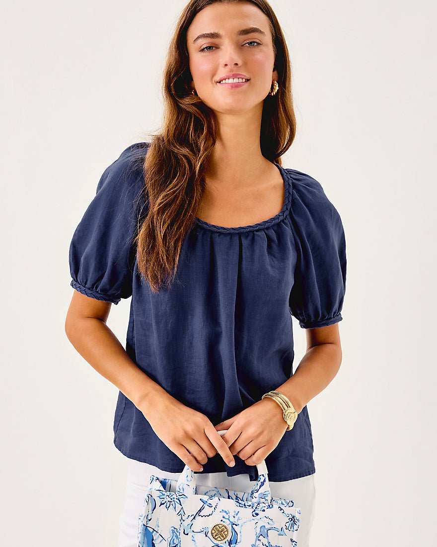 - Easy fit top with a shirred v-neckline, braid details, and raglan sleeves.