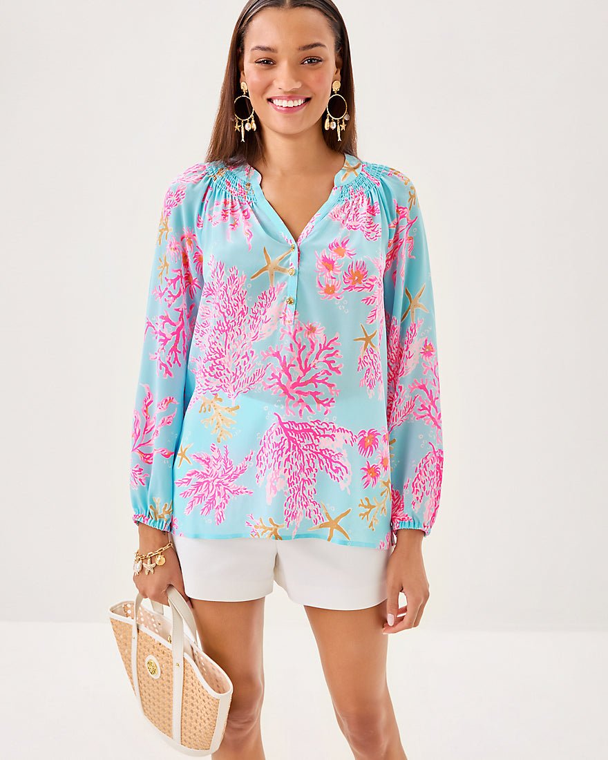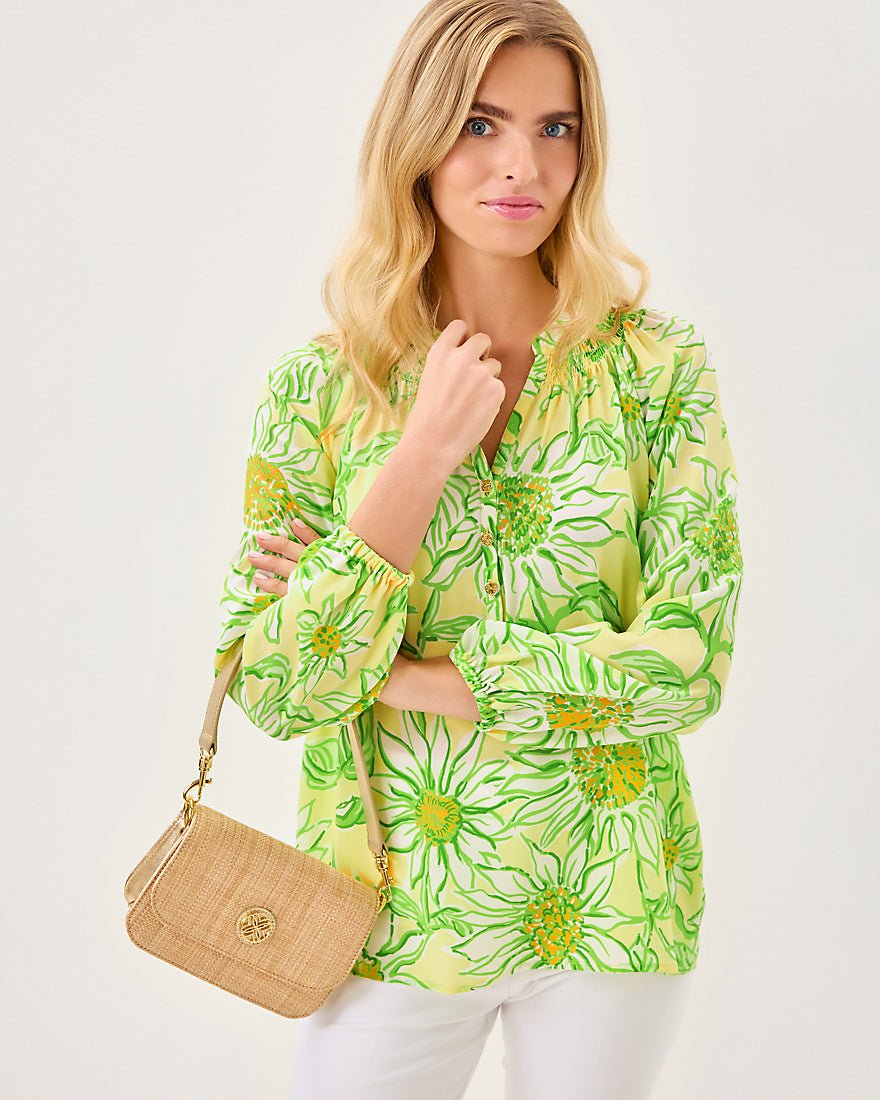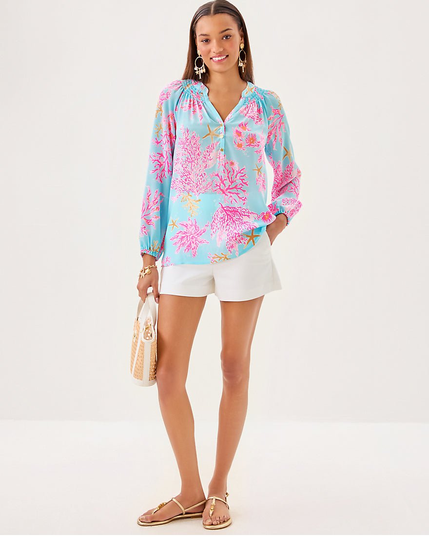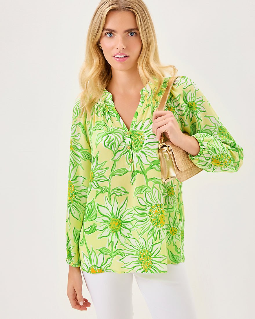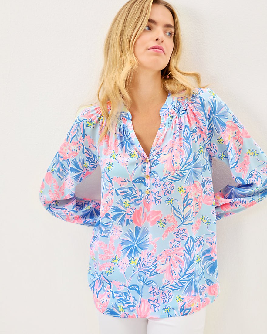A tried-and-true wardrobe staple, our Elsa Silk Top can be dressed up or down. The Elsa has become a Lilly favorite thanks to its loose-fitting body, beautifully smocked neckline, and signature gold buttons at the placket. Pair with jeans, leggings, shorts, or a skirt to make this elegant pullover top your own.