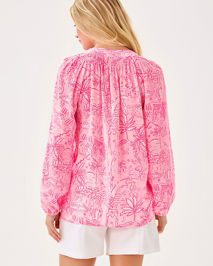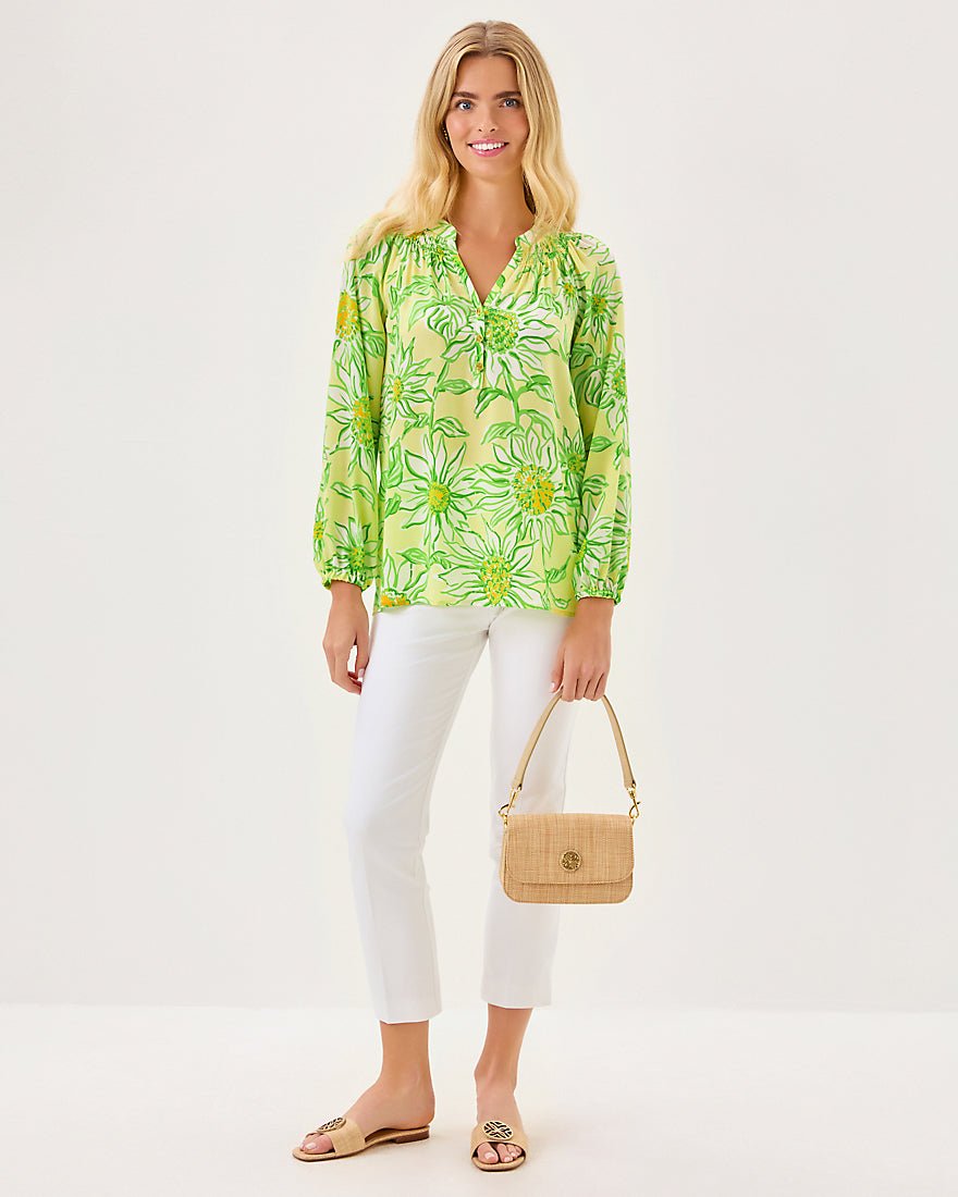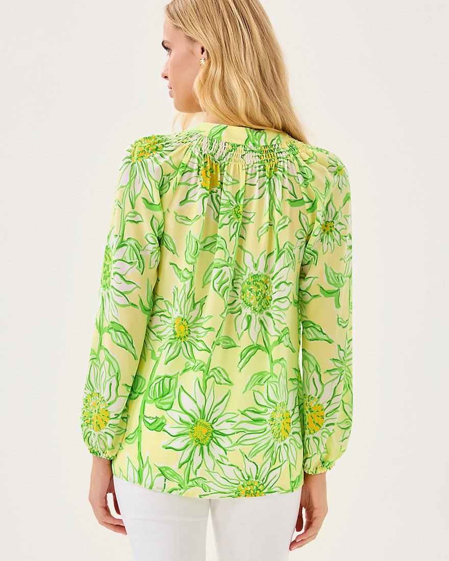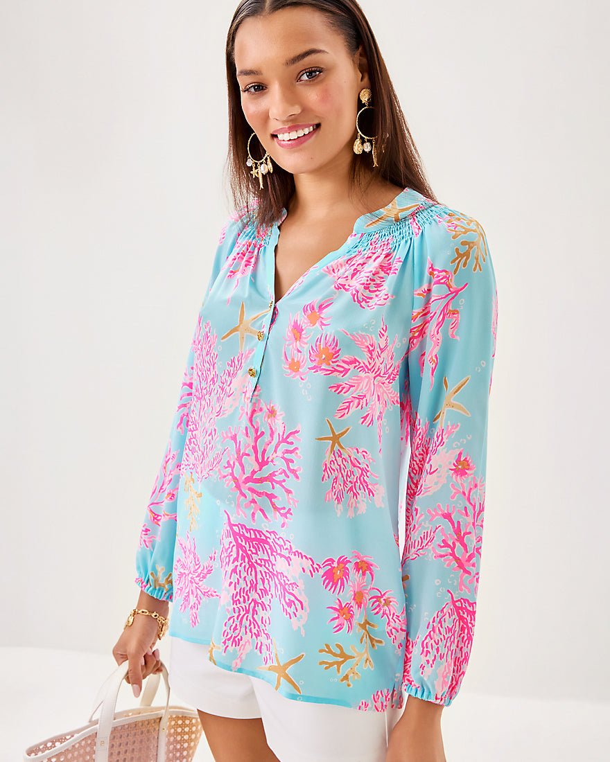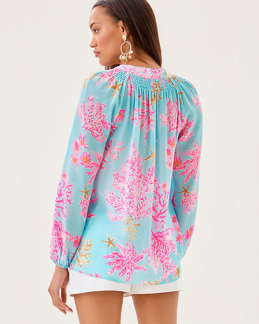 A tried-and-true wardrobe staple, our Elsa Silk Top can be dressed up or down. The Elsa has become a Lilly favorite thanks to its loose-fitting body, beautifully smocked neckline, and signature gold buttons at the placket. Pair with jeans, leggings, shorts, or a skirt to make this elegant pullover top your own.