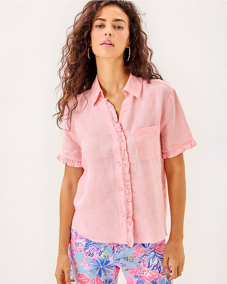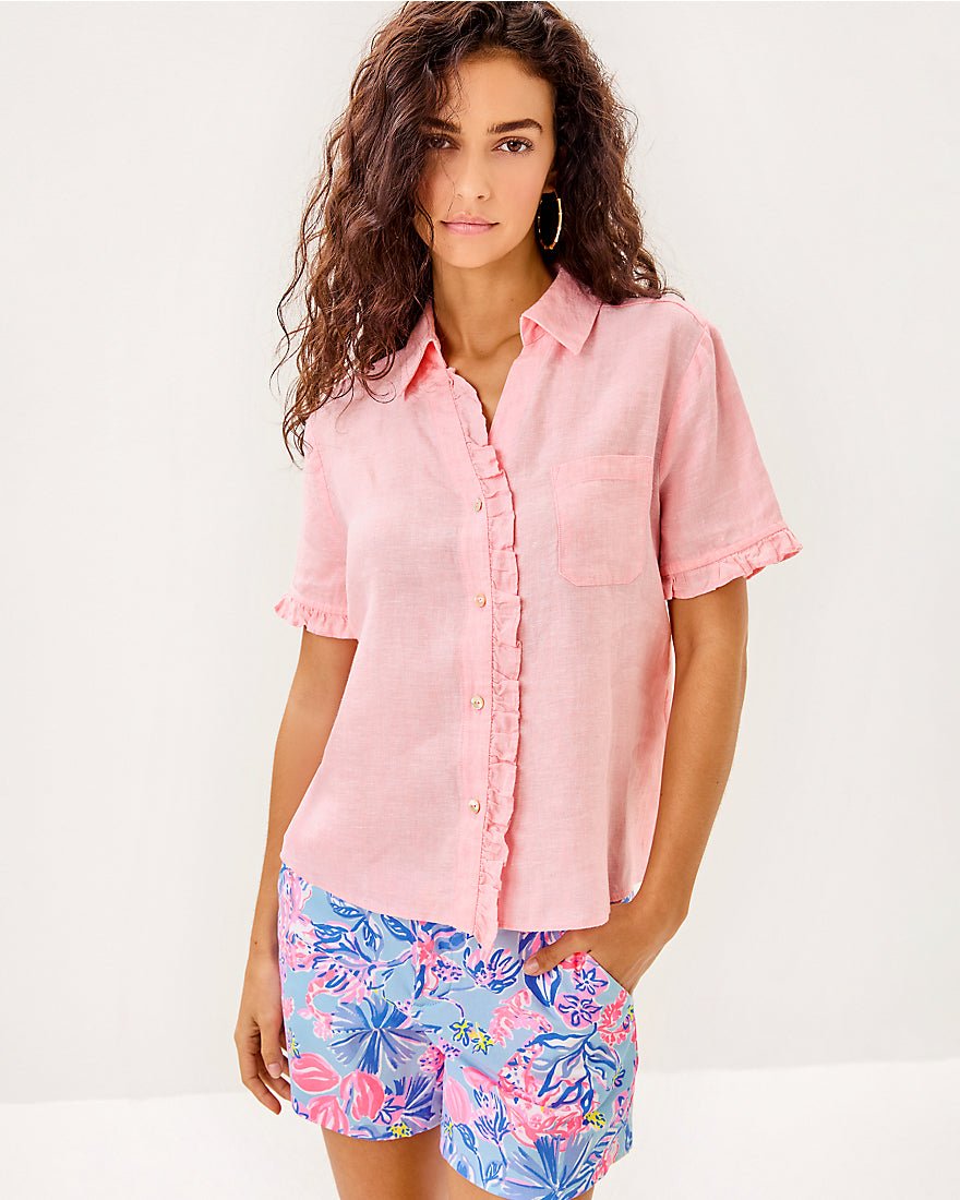 - Easy fit, button front top with short sleeves, a patch pocket, and ruffle details.