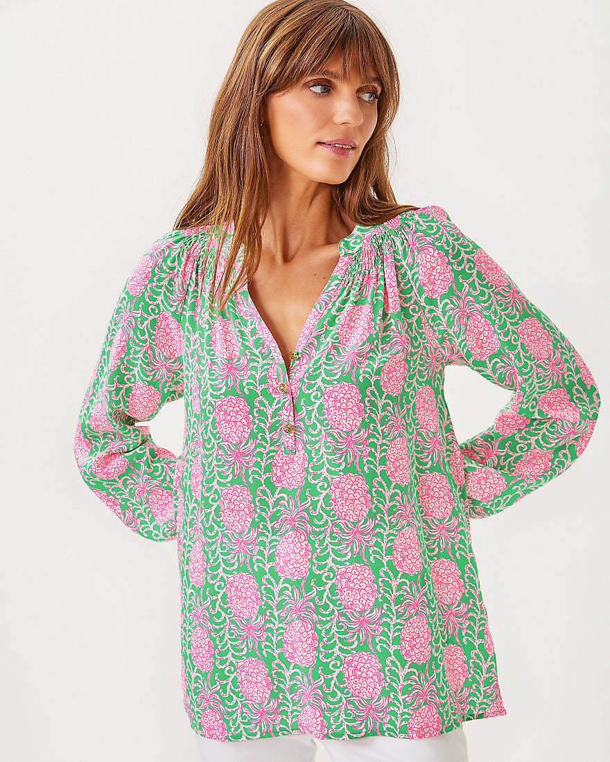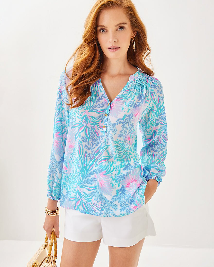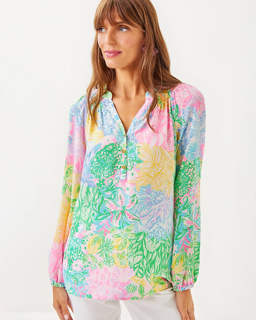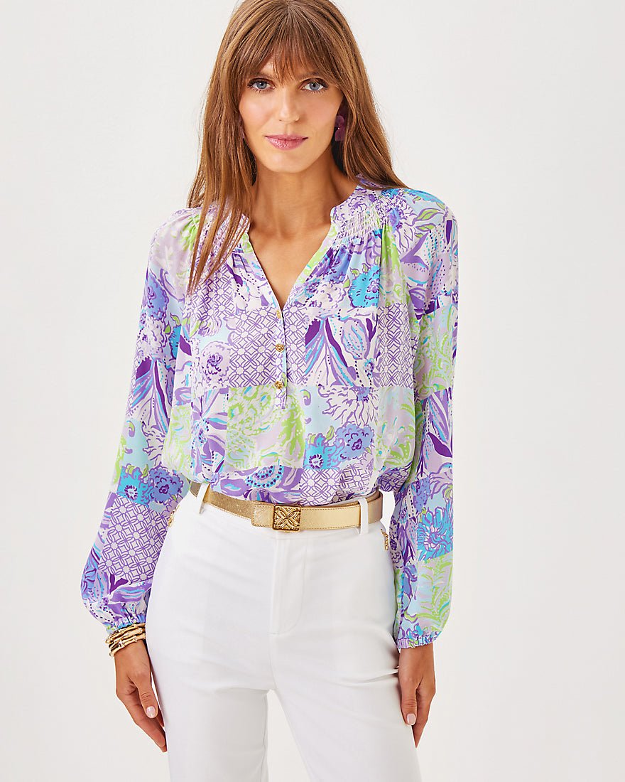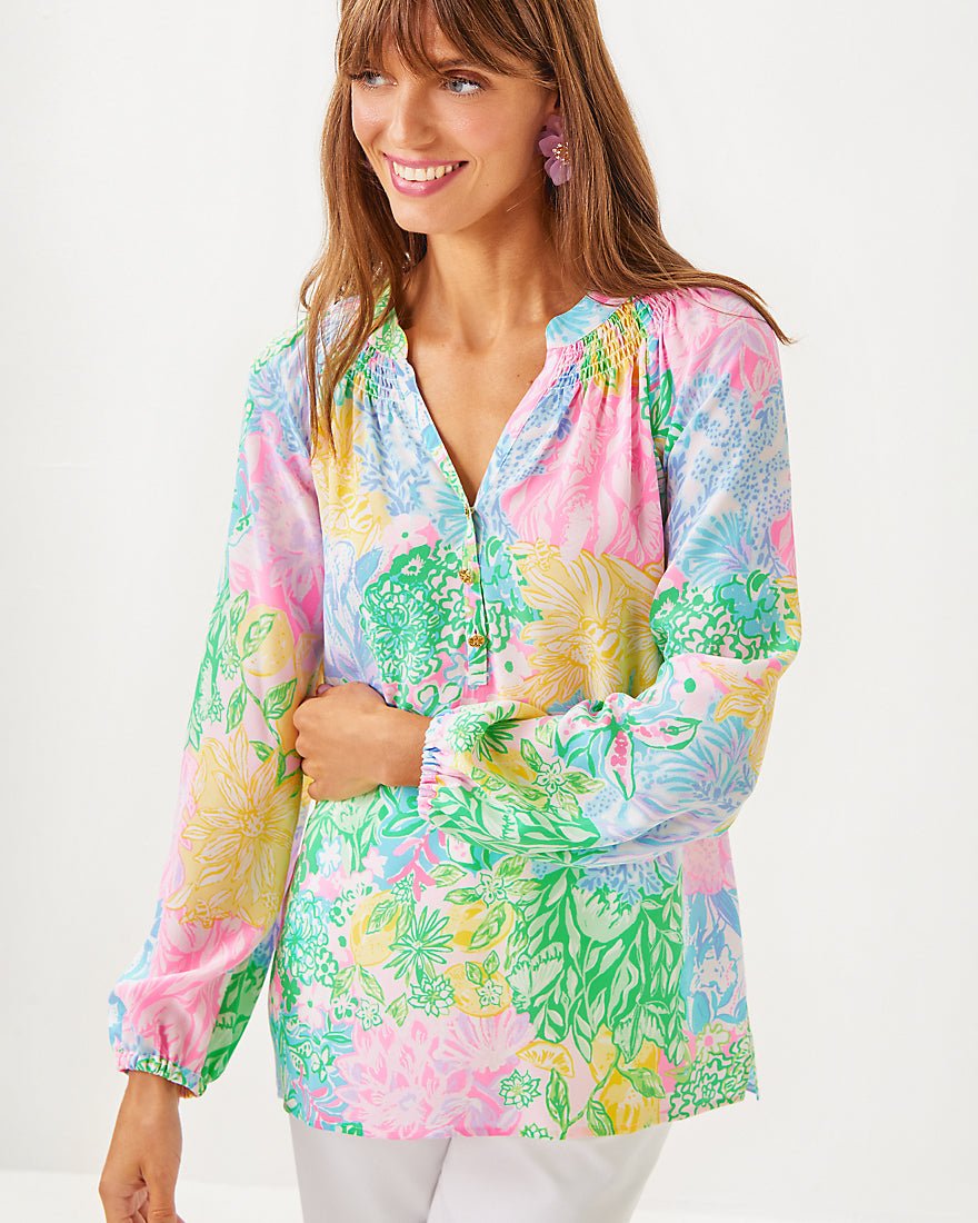 A tried-and-true wardrobe staple, our Elsa Silk Top can be dressed up or down. The Elsa has become a Lilly favorite thanks to its loose-fitting body, beautifully smocked neckline, and signature gold buttons at the placket. Pair with jeans, leggings, shorts, or a skirt to make this elegant pullover top your own.