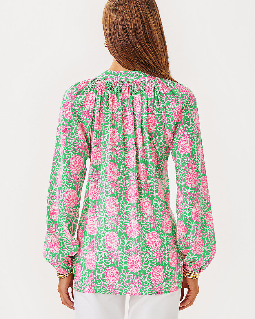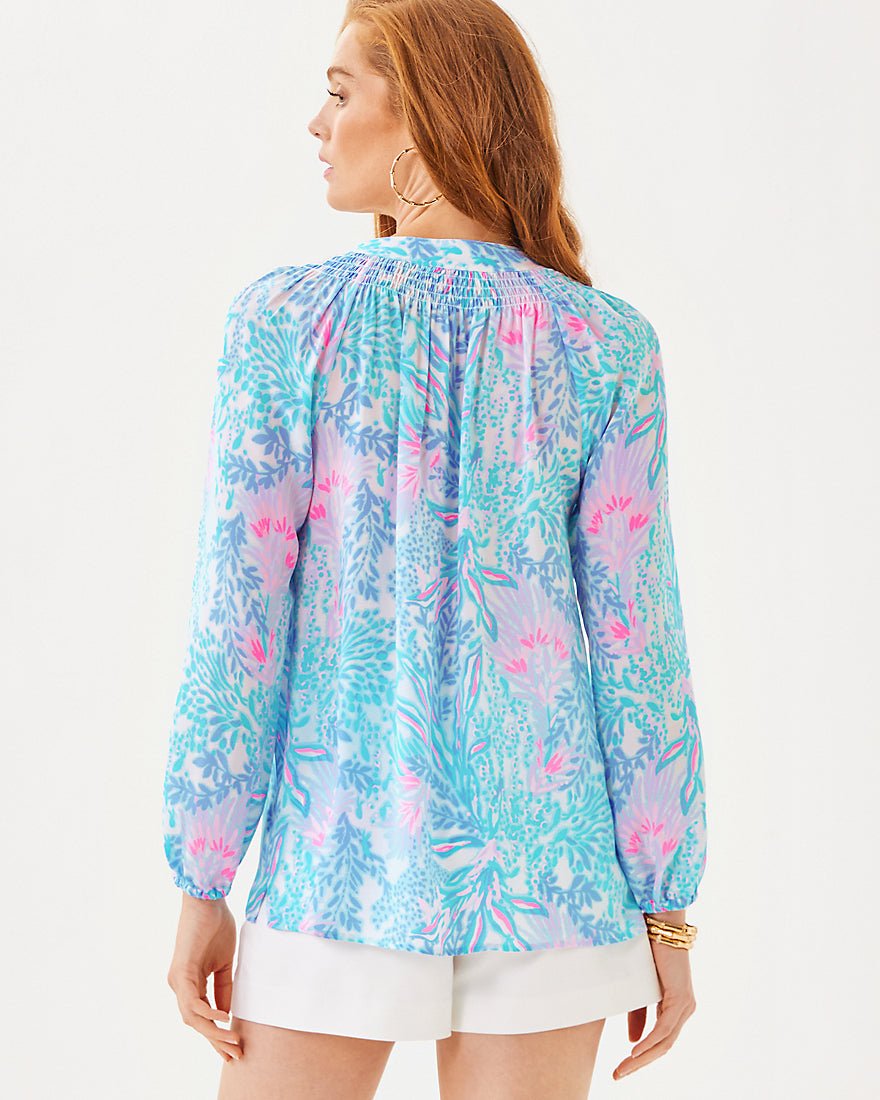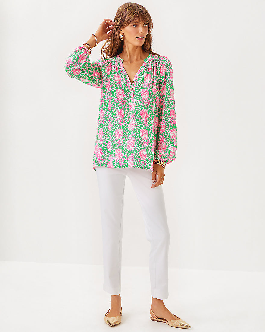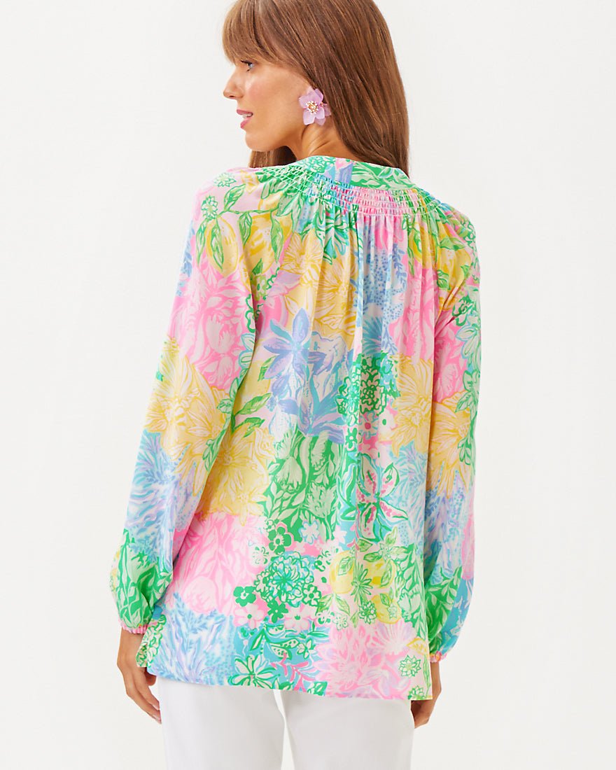 A tried-and-true wardrobe staple, our Elsa Silk Top can be dressed up or down. The Elsa has become a Lilly favorite thanks to its loose-fitting body, beautifully smocked neckline, and signature gold buttons at the placket. Pair with jeans, leggings, shorts, or a skirt to make this elegant pullover top your own.