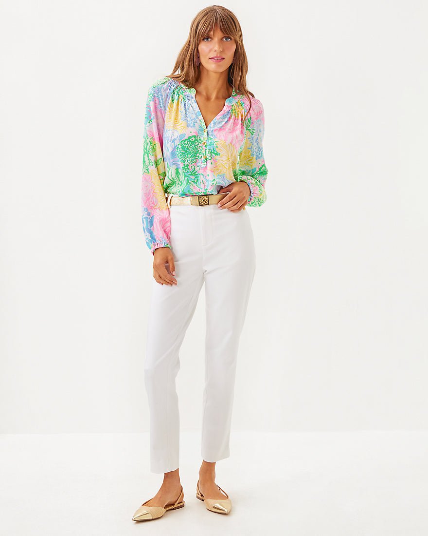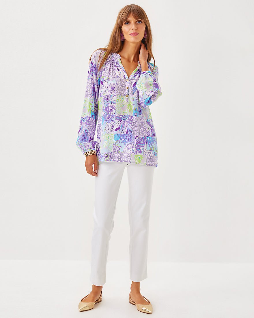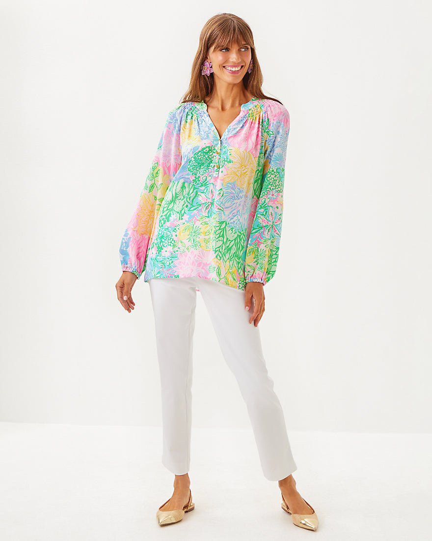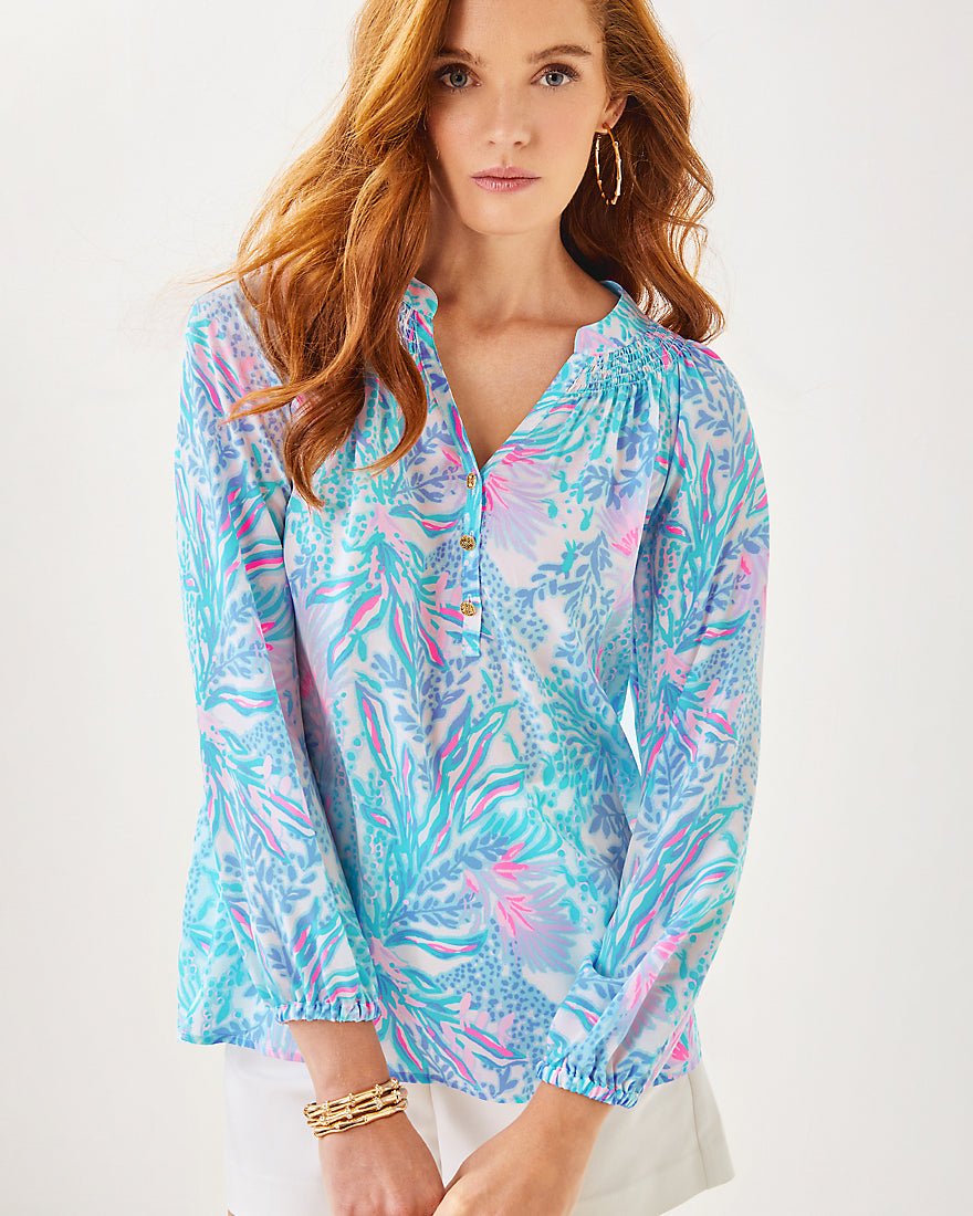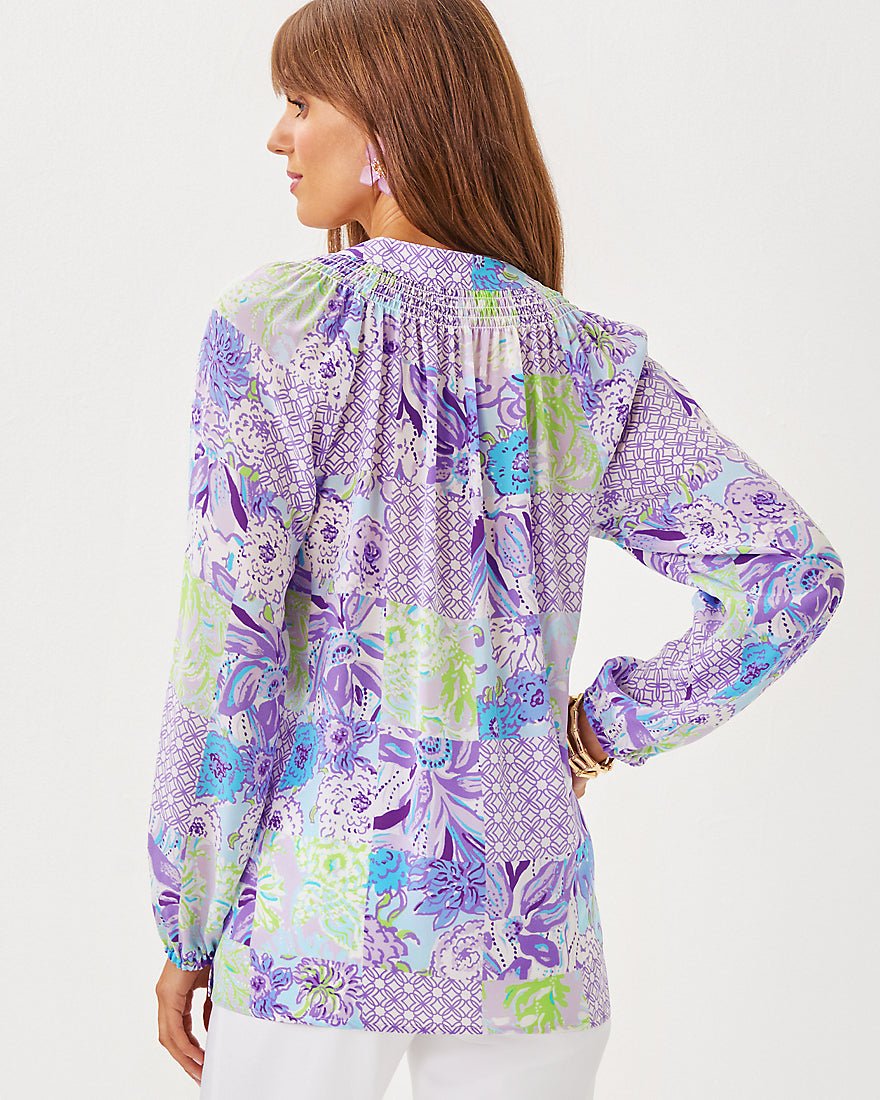 A tried-and-true wardrobe staple, our Elsa Silk Top can be dressed up or down. The Elsa has become a Lilly favorite thanks to its loose-fitting body, beautifully smocked neckline, and signature gold buttons at the placket. Pair with jeans, leggings, shorts, or a skirt to make this elegant pullover top your own.