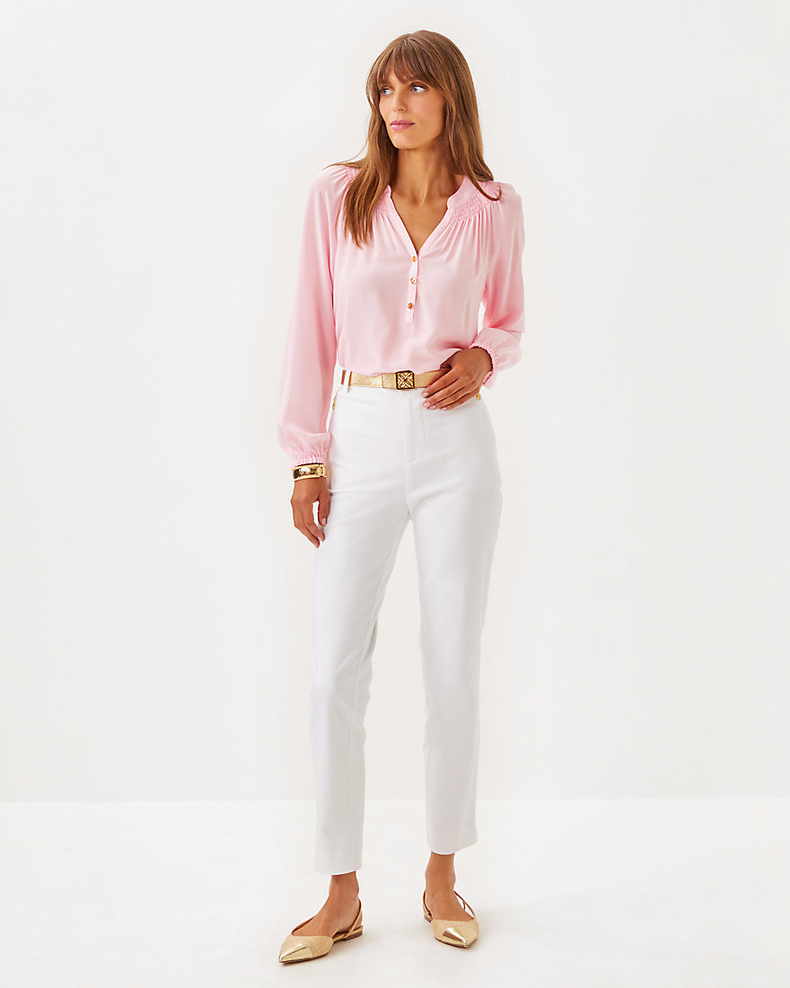 A tried-and-true wardrobe staple, our Elsa Silk Top can be dressed up or down. The Elsa has become a Lilly favorite thanks to its loose-fitting body, beautifully smocked neckline, and signature gold buttons at the placket. Pair with jeans, leggings, shorts, or a skirt to make this elegant pullover top your own.
