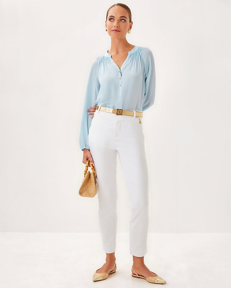 - Easy fit, pullover blouse with bracelet-length sleeves.