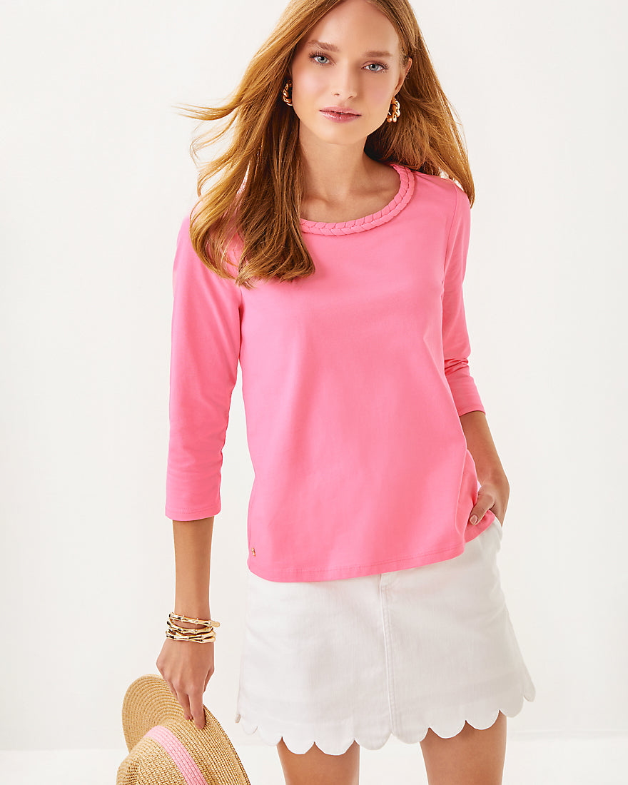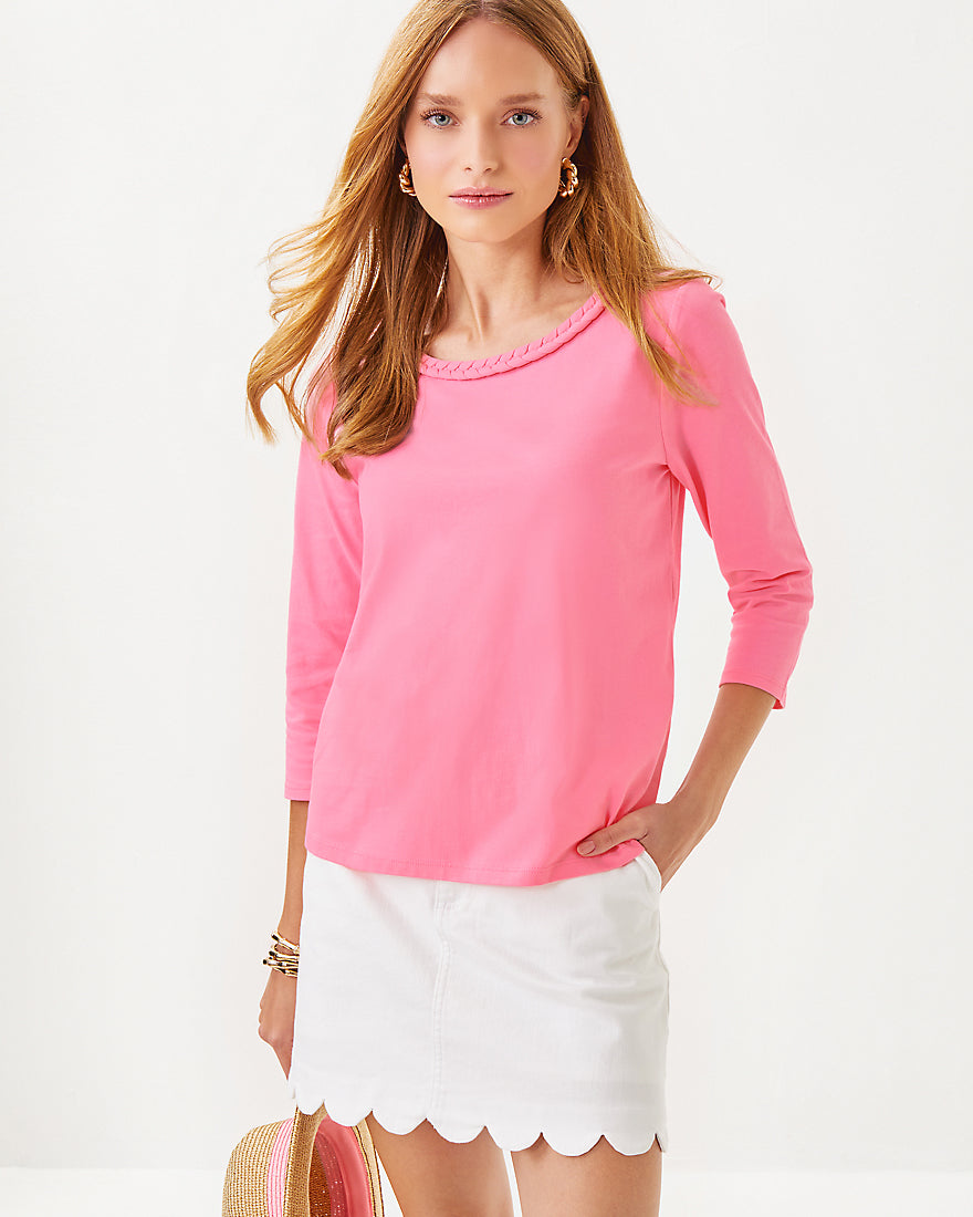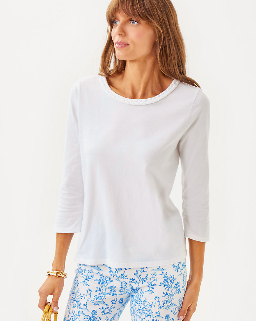 - Straight fit top with a braided trim crew neckline and 3/4 sleeves.