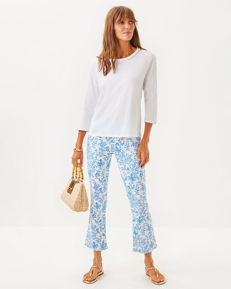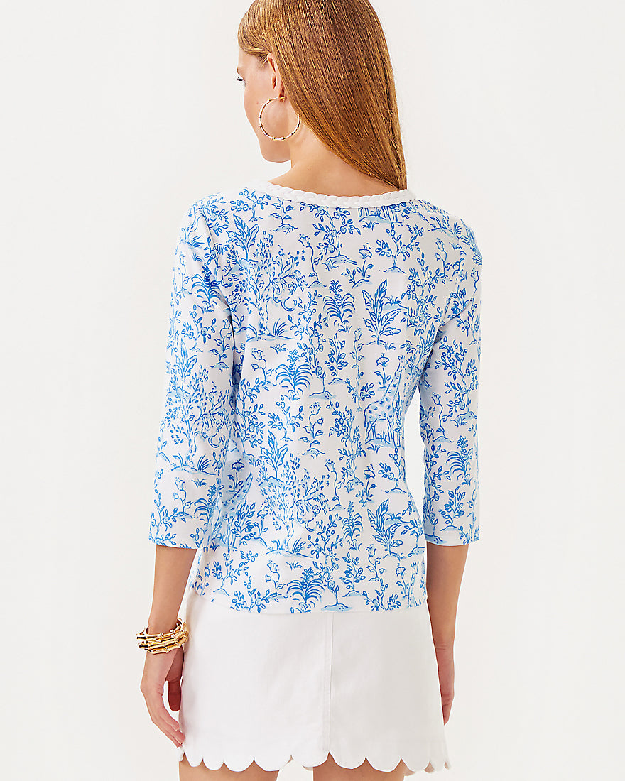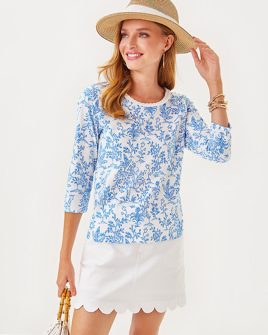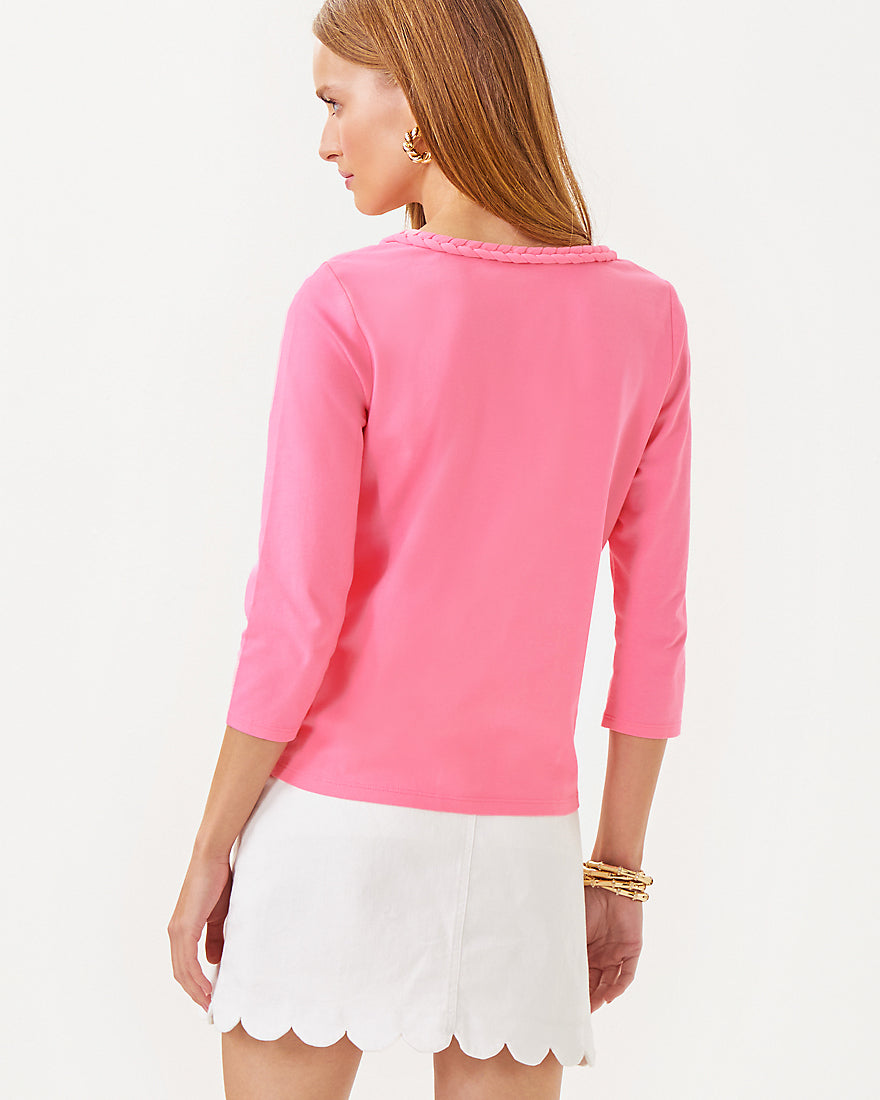 - Straight fit top with a braided trim crew neckline and 3/4 sleeves.