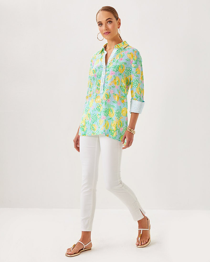 Meet the Riverlyn Pieced Print Tunic. With its easy fit, 3/4 sleeves, and machine washable Seacoast Linen fabric, it's perfect for relaxed days by the beach or outings around town.