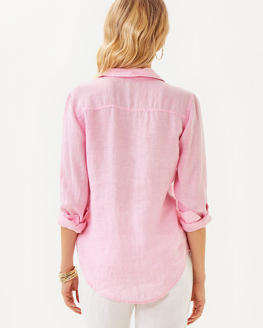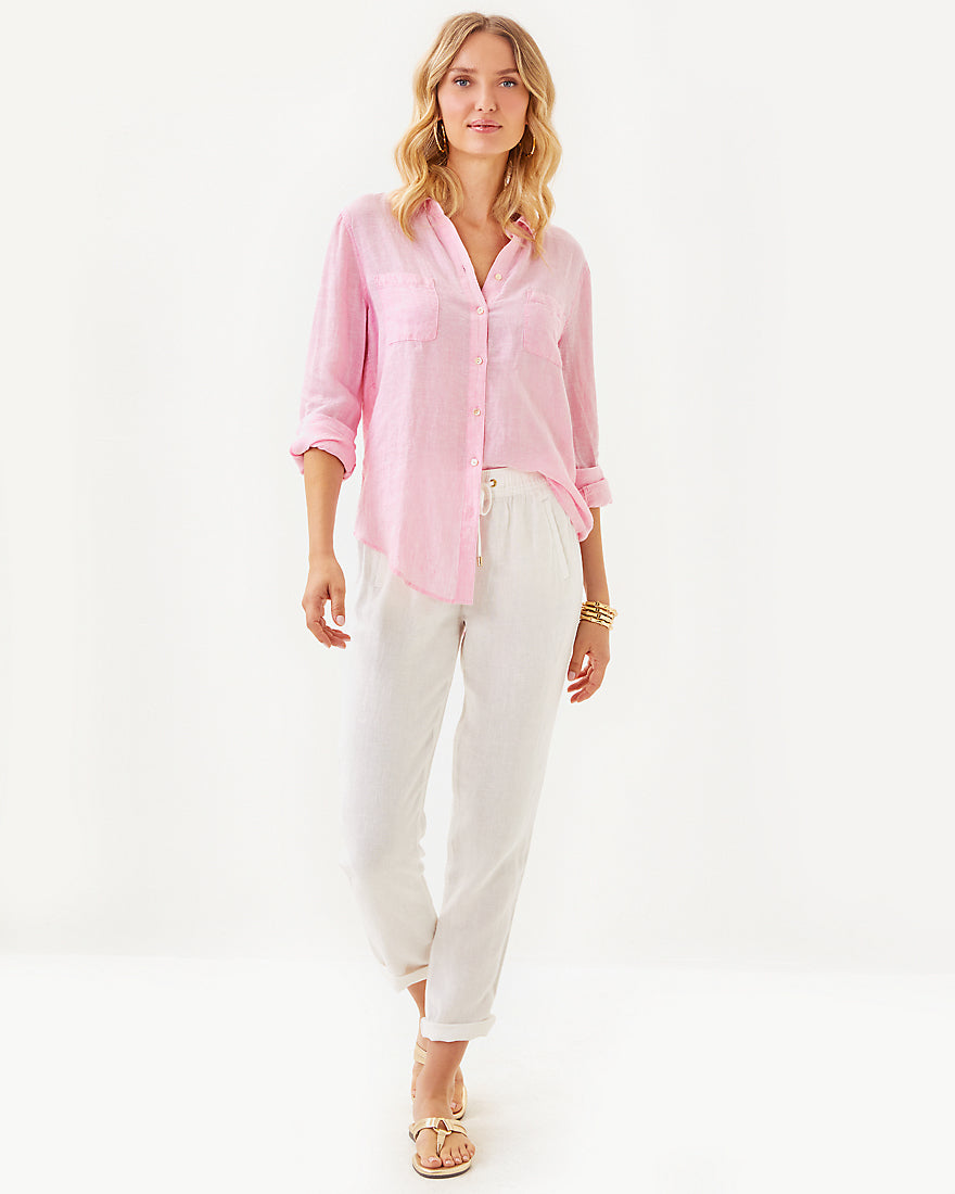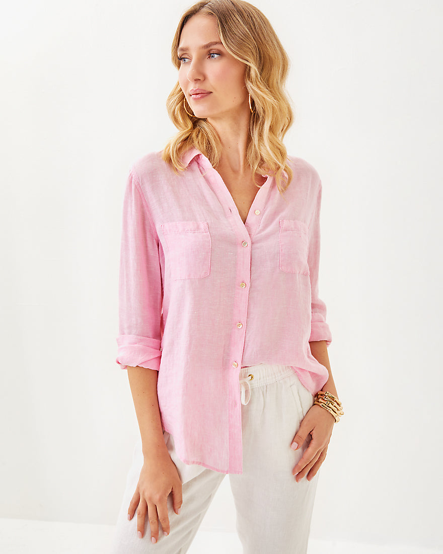 Breezy and exceptionally versatile, our Sea View Linen Button Down Top is an essential addition to your wardrobe. Made from natural European-grown fibers, this style will get softer and more luxurious with every wash and wear.