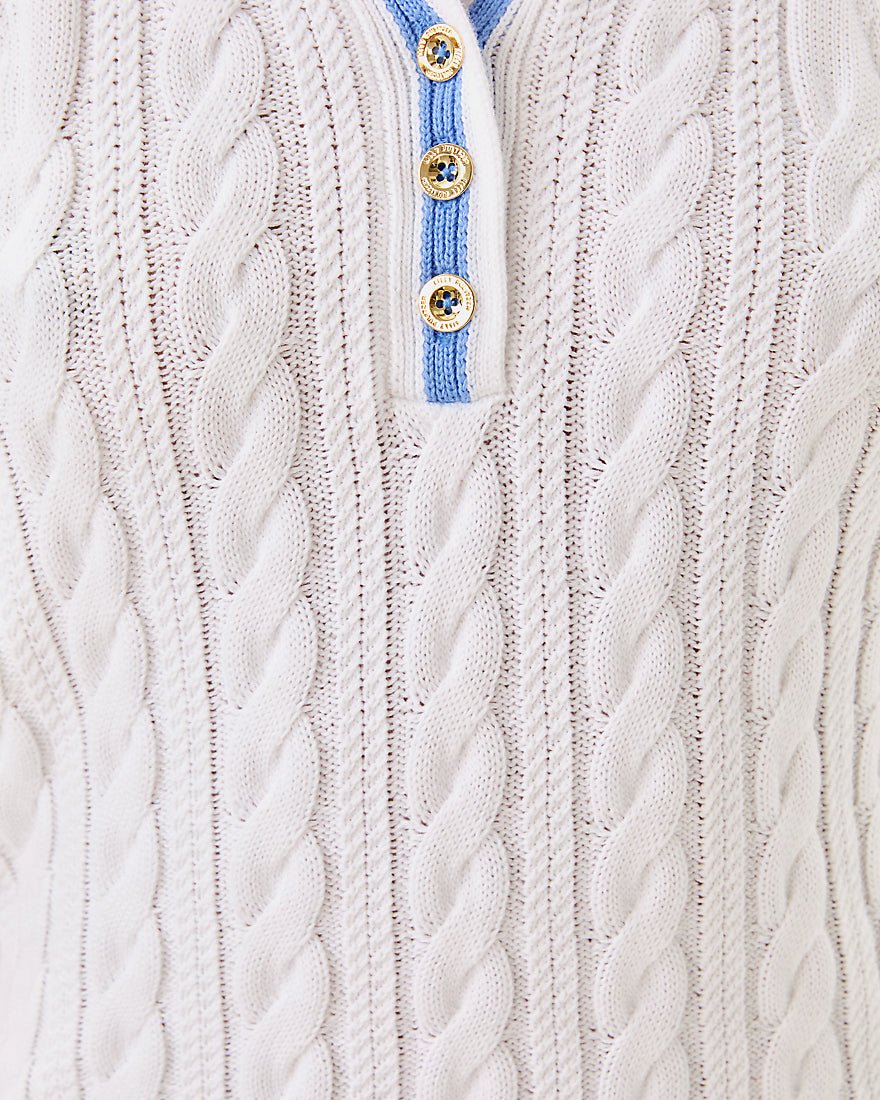 - Straight fit, sleeveless, halter sweater polo with cable stitches, striped trims, and buttons.