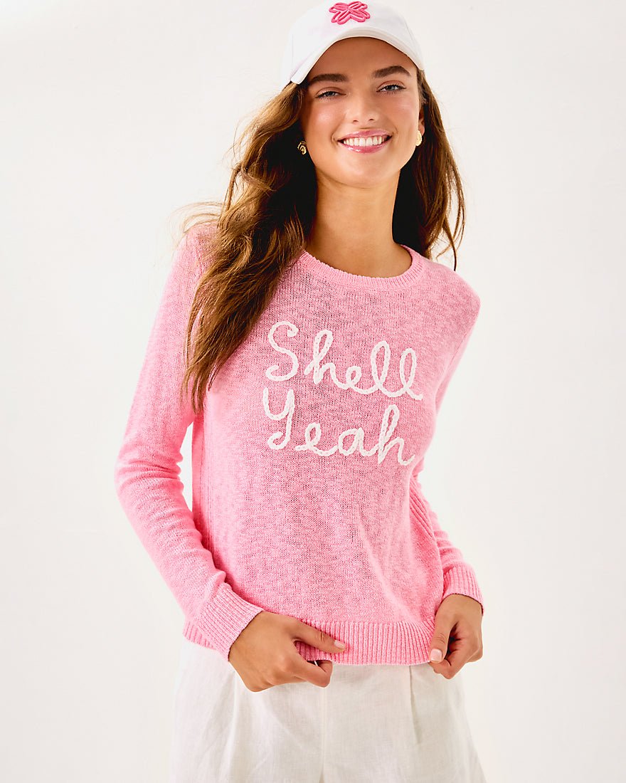- Easy fit, long sleeve sweater with a round neckline and novelty wording