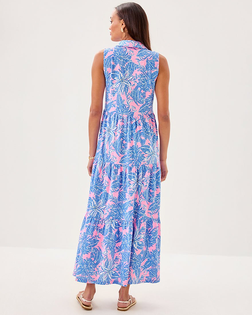 •  Swing fit, tiered maxi dress with a collar and half placket.