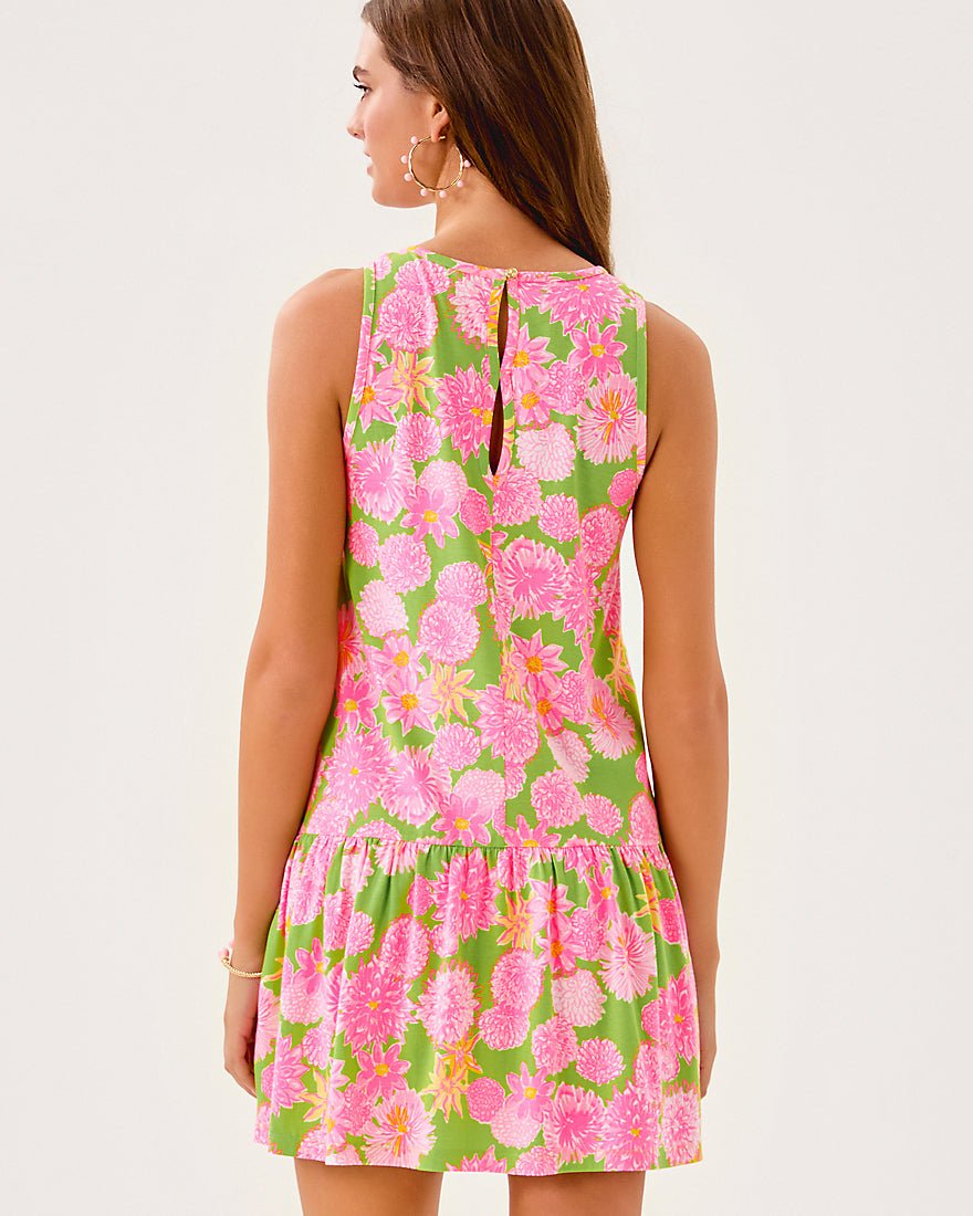 • Swing fit tank dress with cut-in armholes, a back keyhole detail, and a tall hem ruffle.