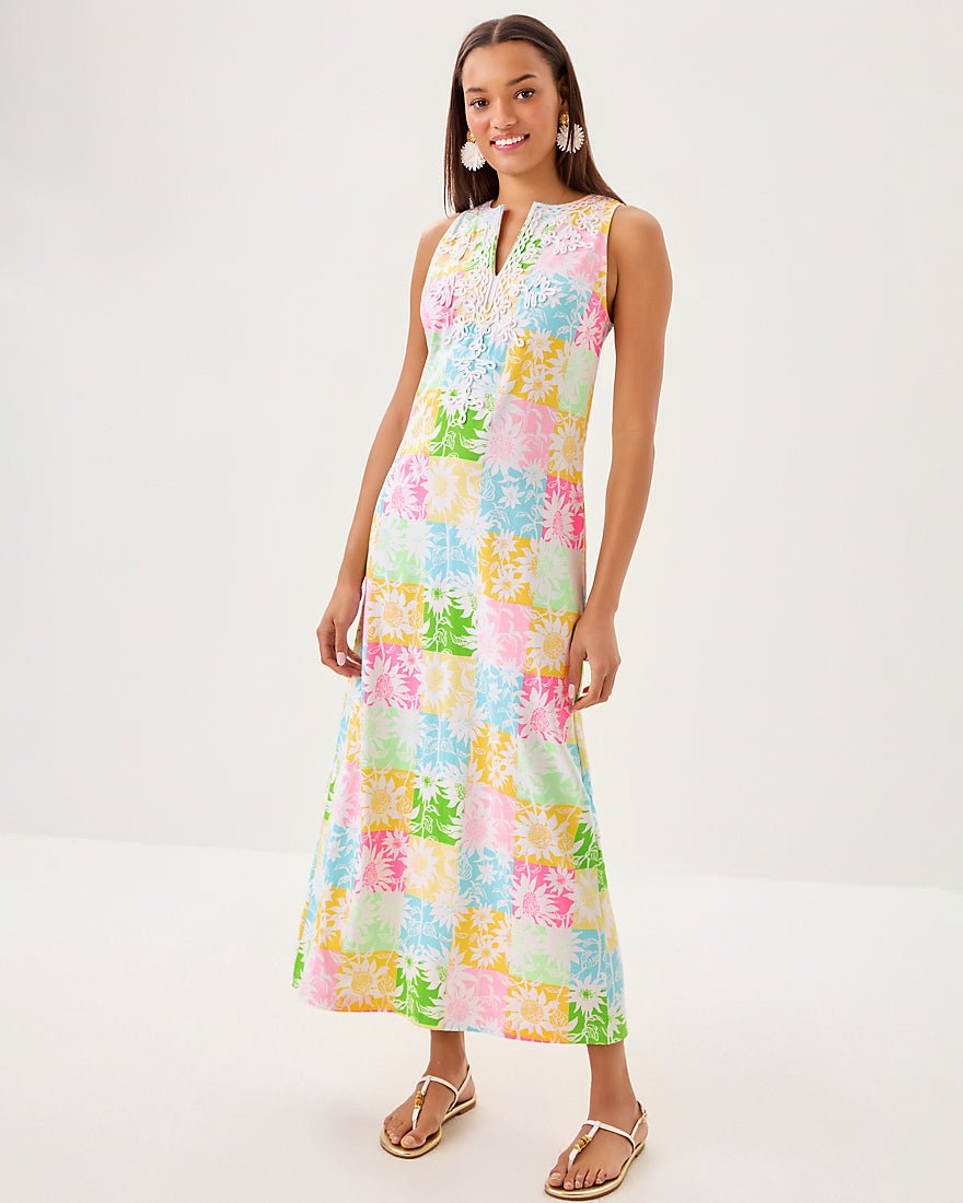 - Straight fit maxi dress with a back slit and soutache embellishment at the notch neckline.