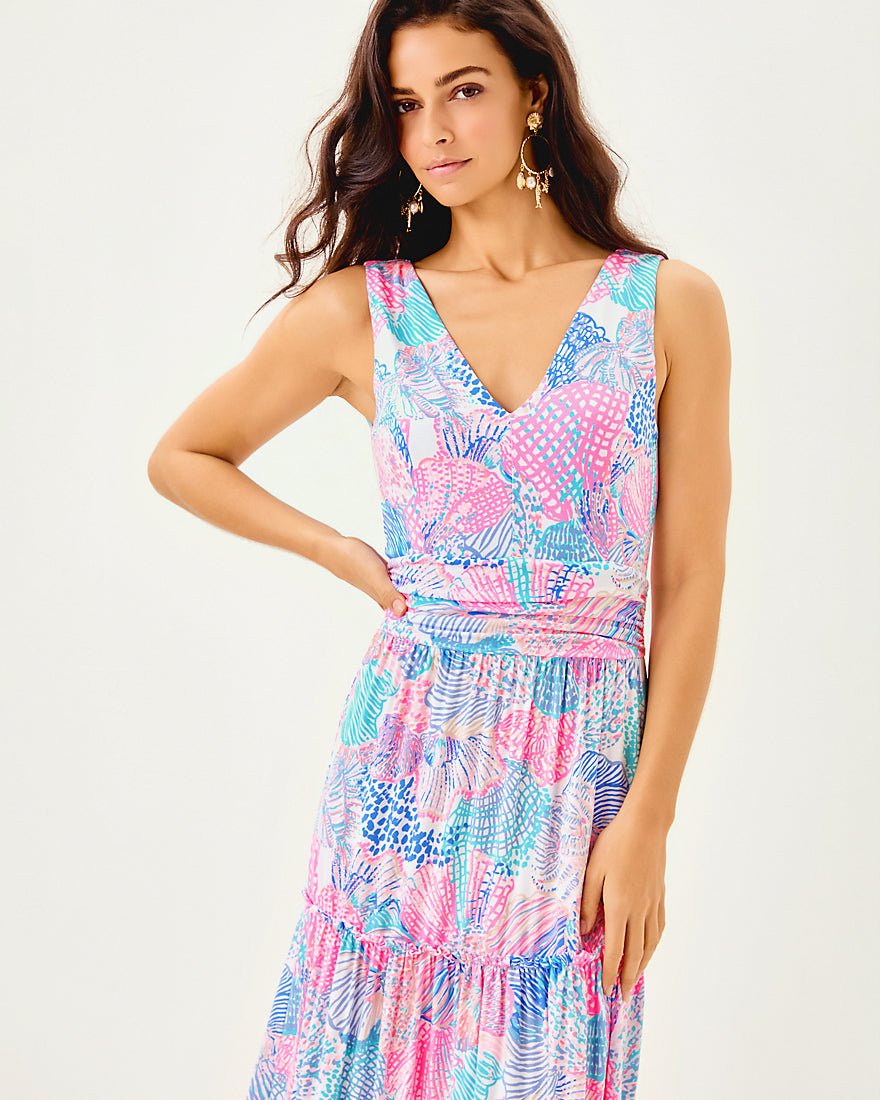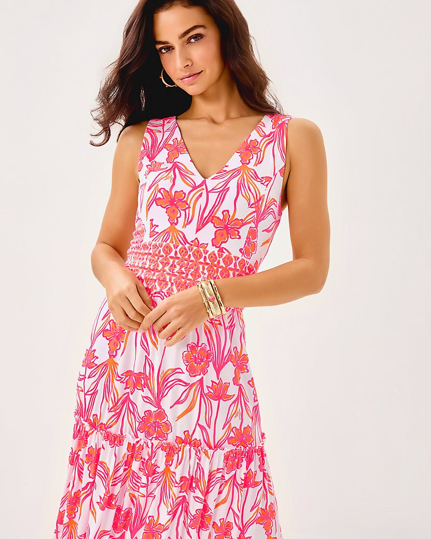 • Fit-and-flare, v-neck midi dress with a ruched waistband and tiered skirt.